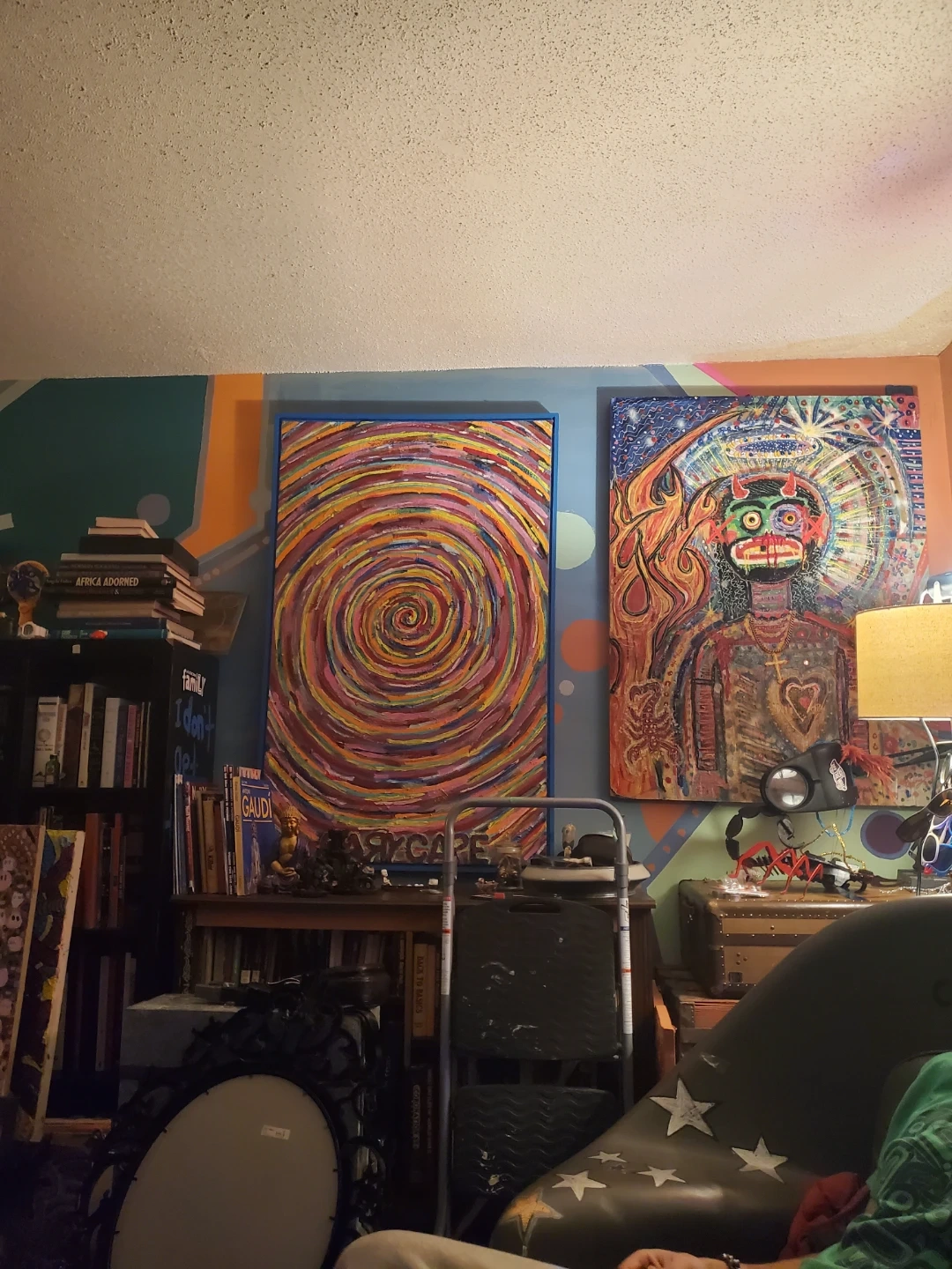Colorful abstract painting featuring a hypnotic spiral design. It's framed with a blue border. The artwork has a vibrant, textured finish. This piece would add a pop of colour to any room!