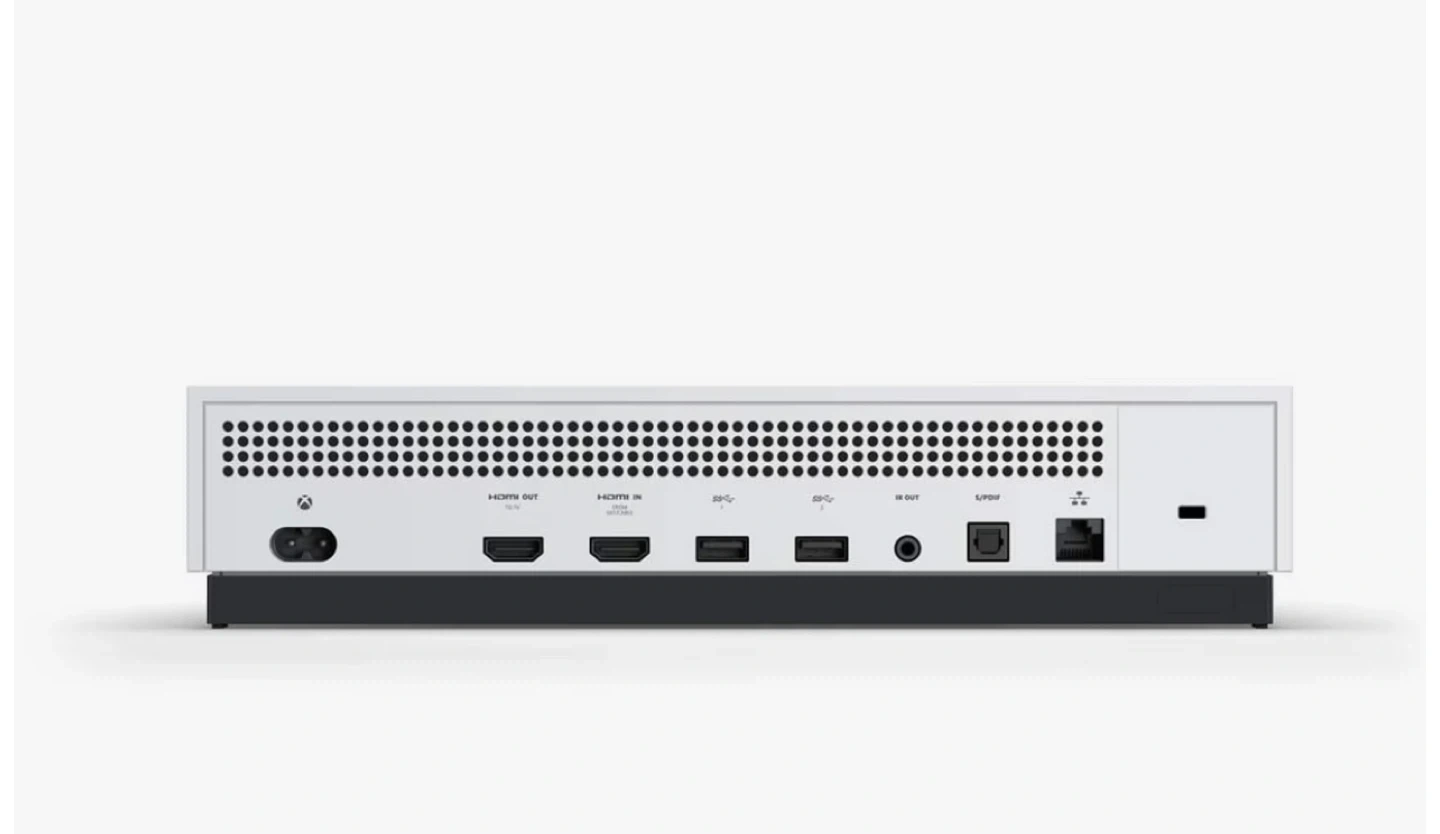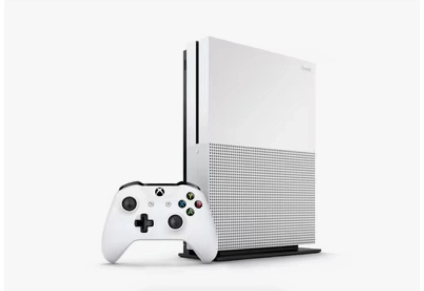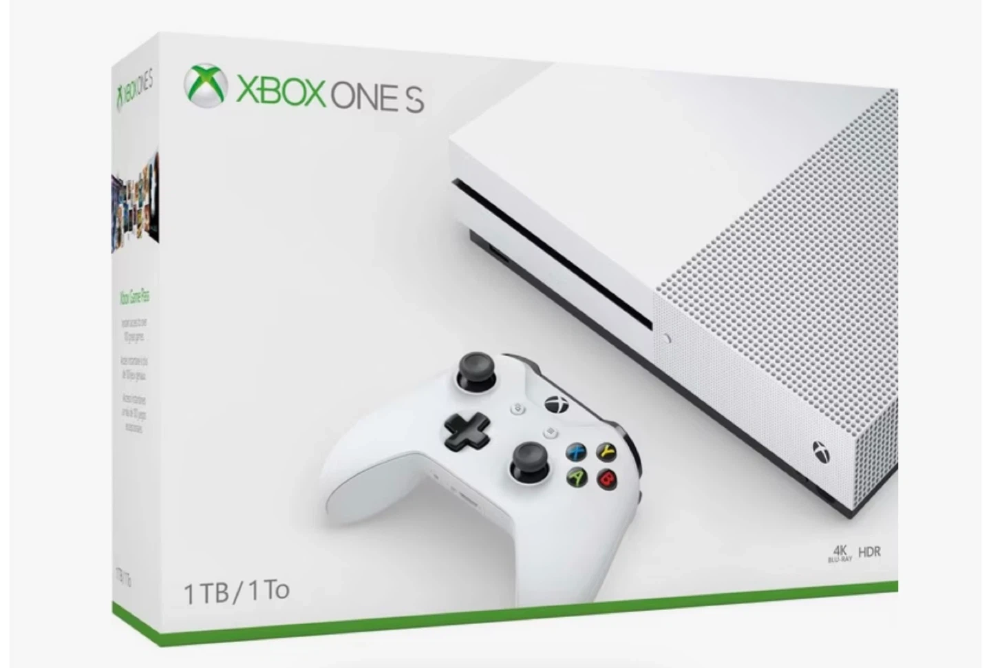 This is a white Microsoft Xbox One S gaming console with a 1TB hard drive. It comes with a white controller. The console supports 4K HDR and Blu-ray playback.