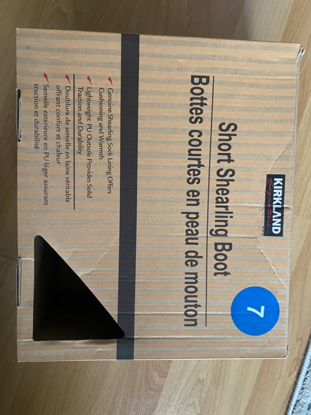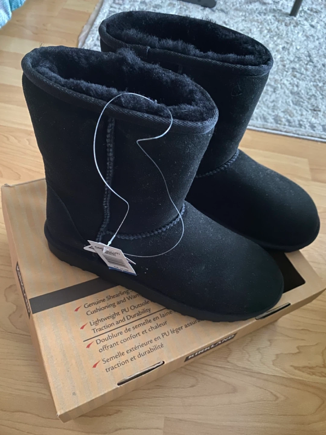 These black Kirkland Signature short shearling boots offer genuine shearling sock lining for cushioning and warmth. The boots are black and come in size 7. New with tags, never worn. Cash only.