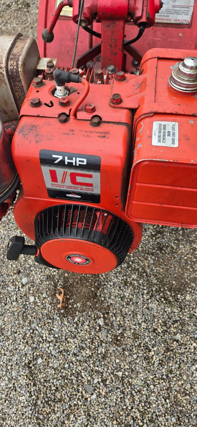 Industrial/Commercial engine. Metal construction with heavy-duty tines and large tractor-style tires.