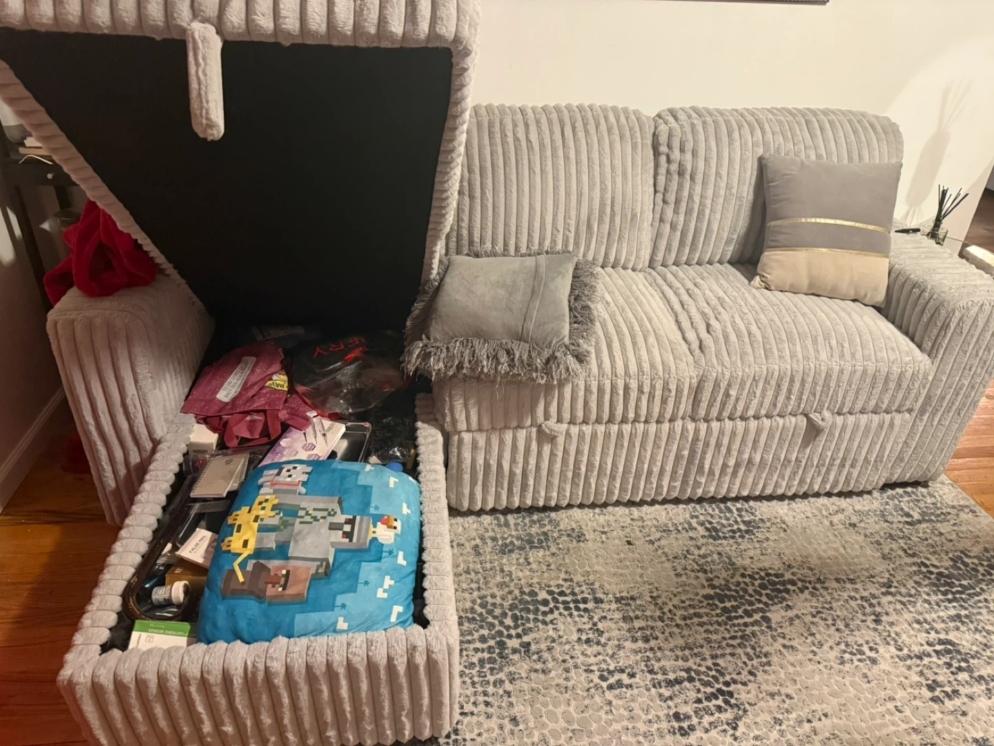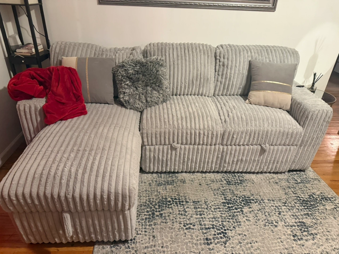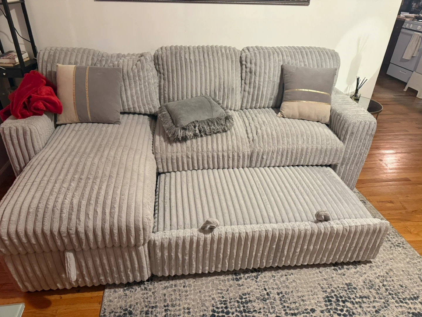 This light gray sectional sofa features a soft corduroy fabric. It includes a pull-out bed and storage space within the chaise. Two decorative pillows are included. It's perfect for small spaces needing versatile seating and sleeping options!
