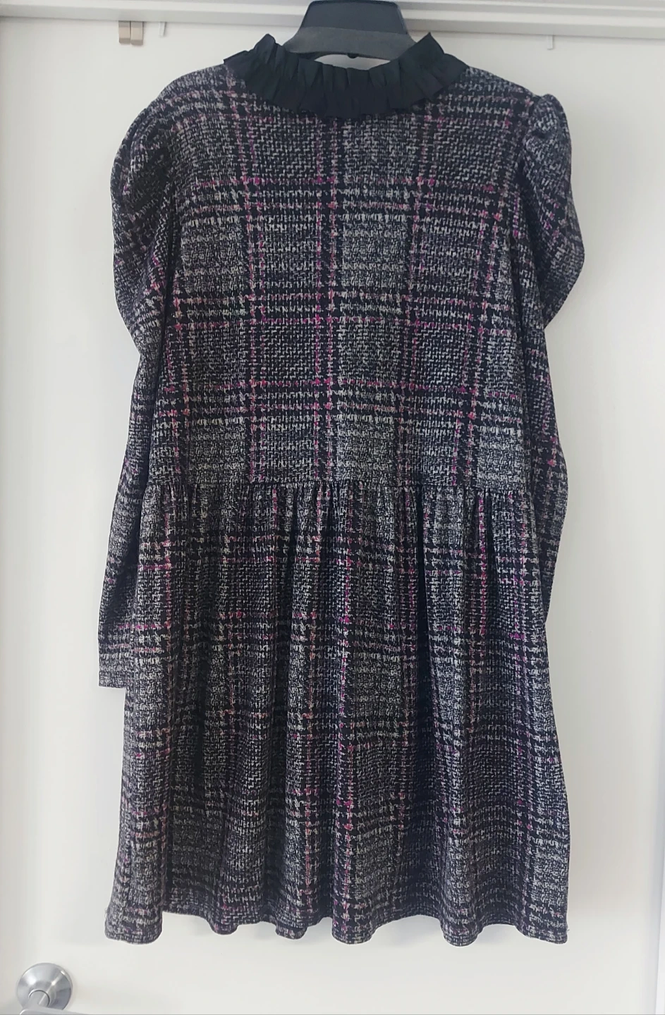 A women's long-sleeve dress featuring a classic plaid pattern. It has a ruffled collar and a gathered waistline. Made in Vietnam from a textured woven fabric.