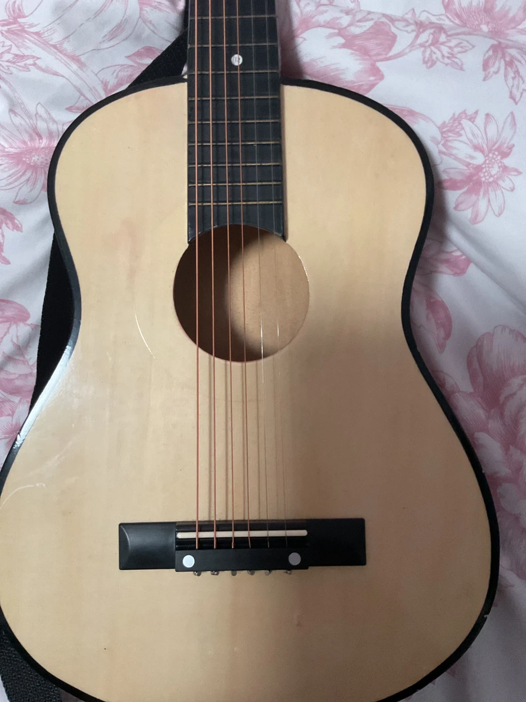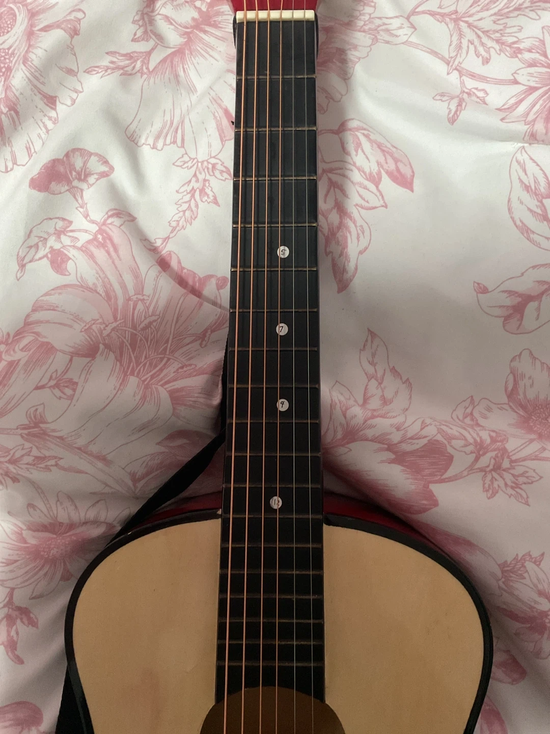 Selling a used 2/4 scale acoustic guitar. It features a red headstock and a beige body. It's in good condition and ready for a new home!