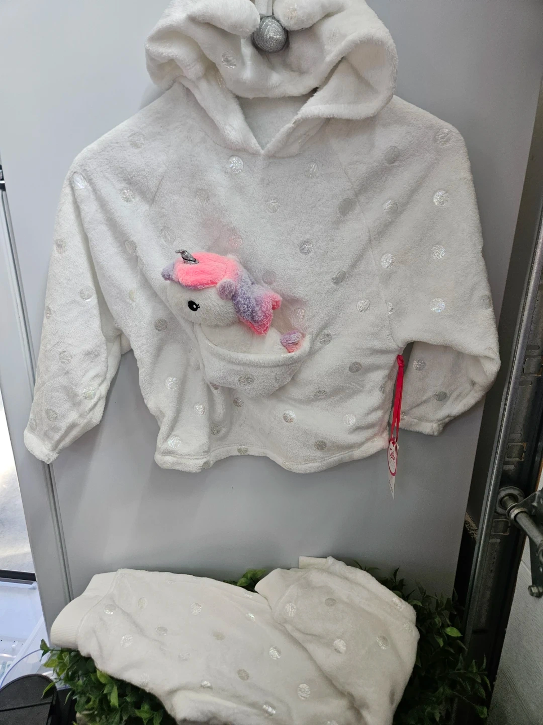 White plush unicorn pajama set with silver polka dots. Includes a small plush unicorn keychain attached to the pocket. Size is 5/6.