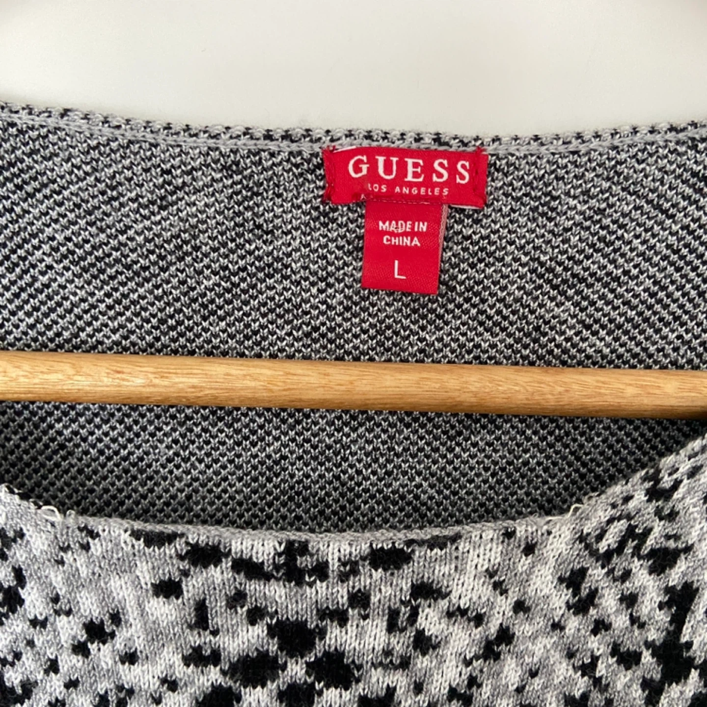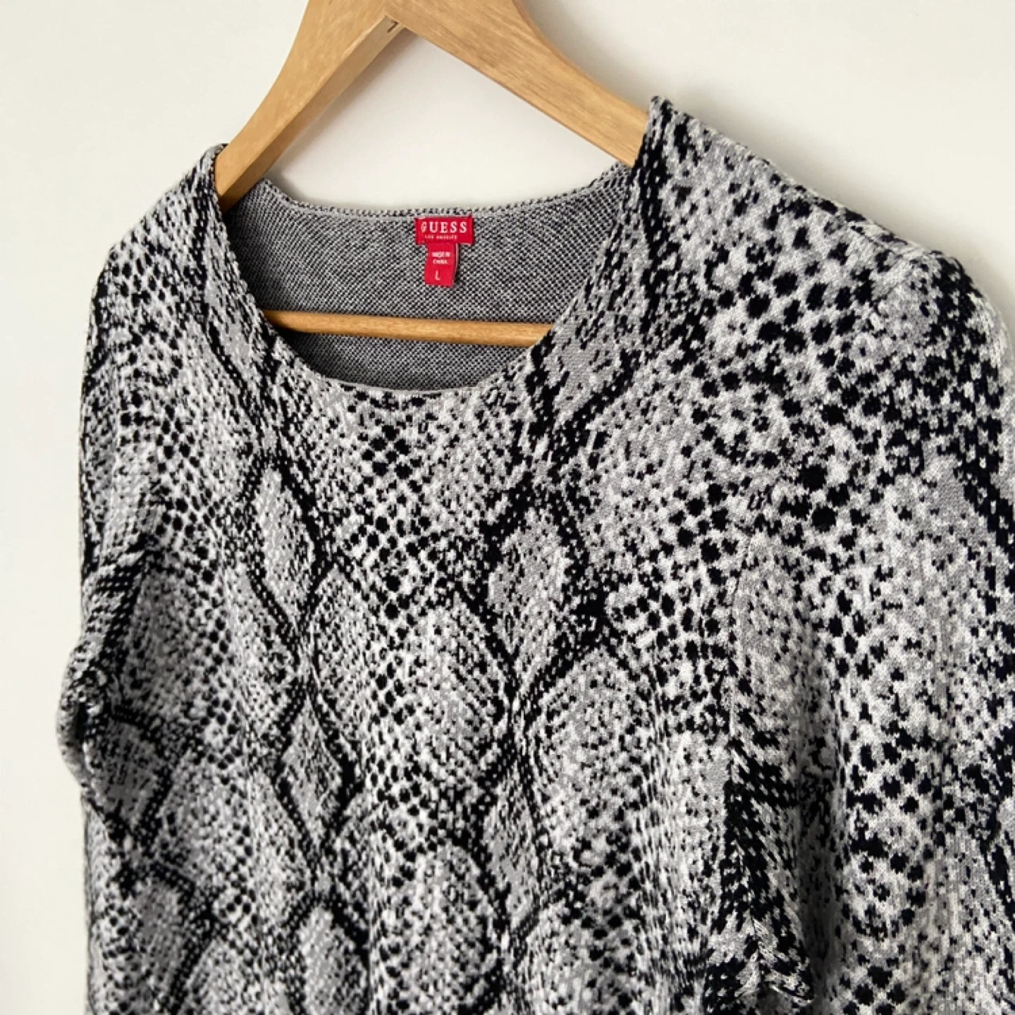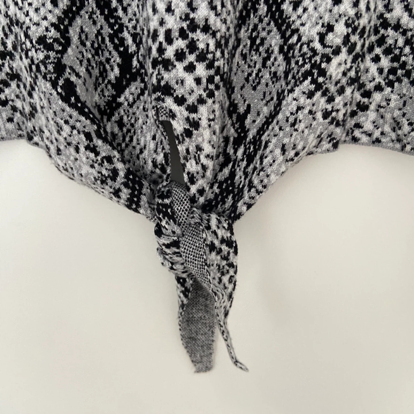 A stylish GUESS sweater featuring a black and grey snake print. It's designed with long sleeves and a tie-front detail. Made from a comfortable knit material.