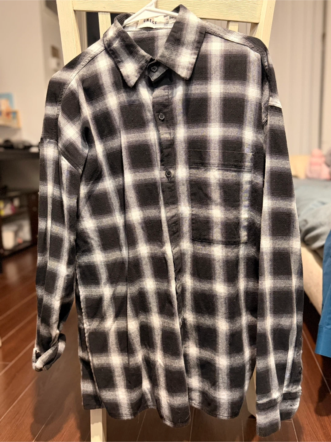 A classic black and white plaid flannel shirt from UNECE. It's a long-sleeved button-up style with a chest pocket. Soft and comfortable material. No dirty and scratches.