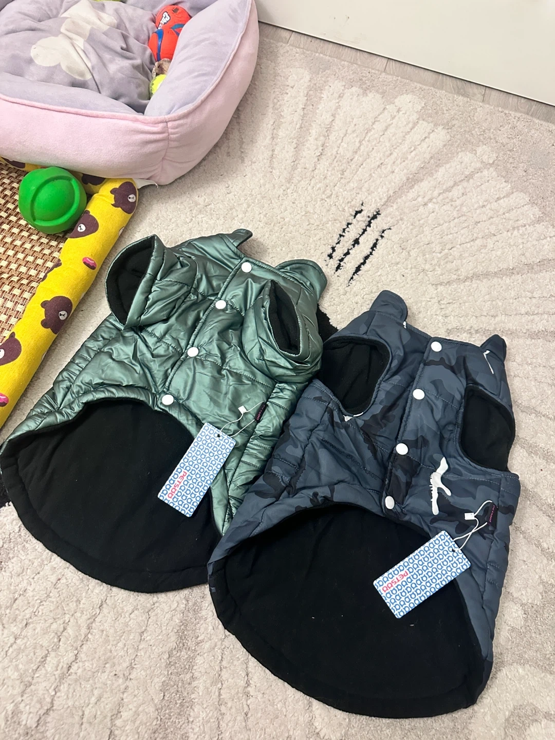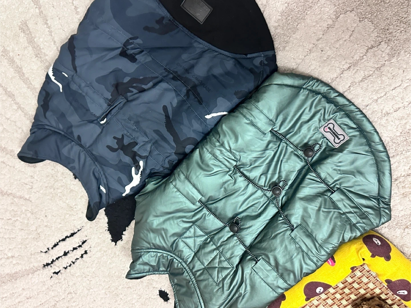 Around 25 pounds 、Two quilted dog vests, one in a shiny green and the other in a grey camouflage pattern. They feature snap closures for easy dressing. Perfect for keeping your furry friend warm on cooler days!