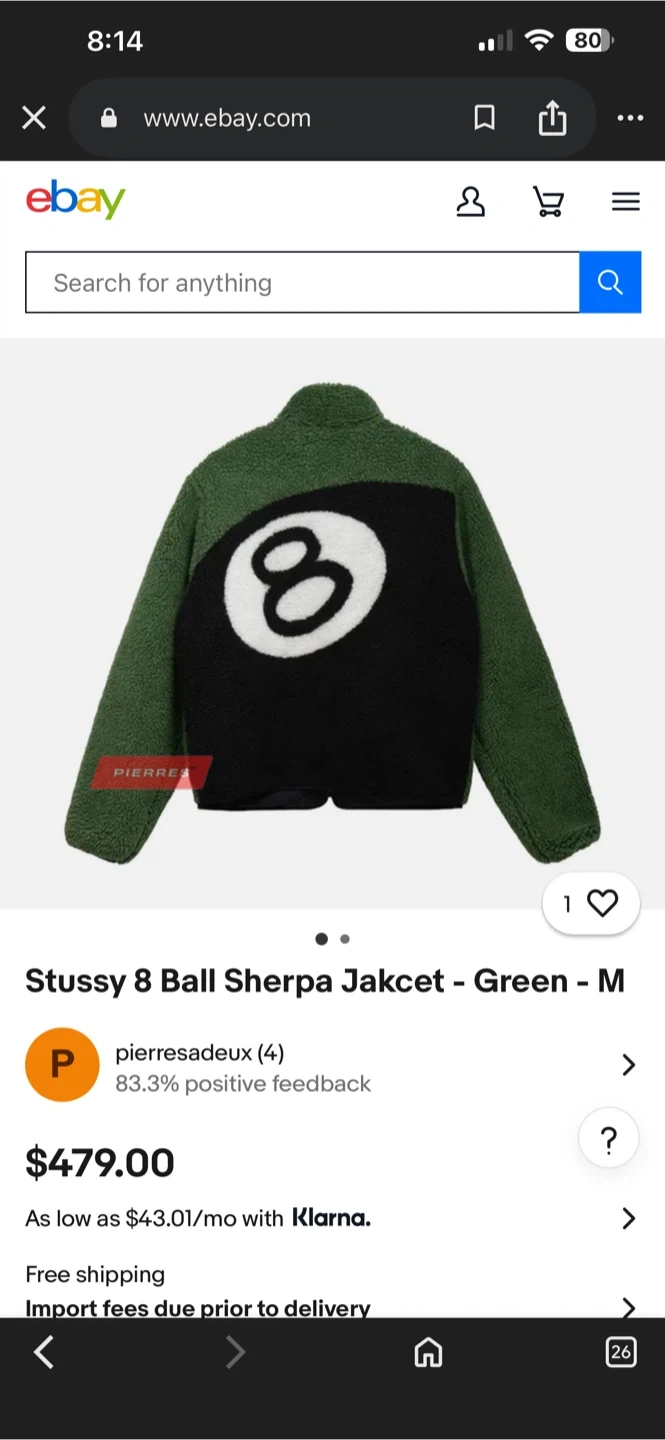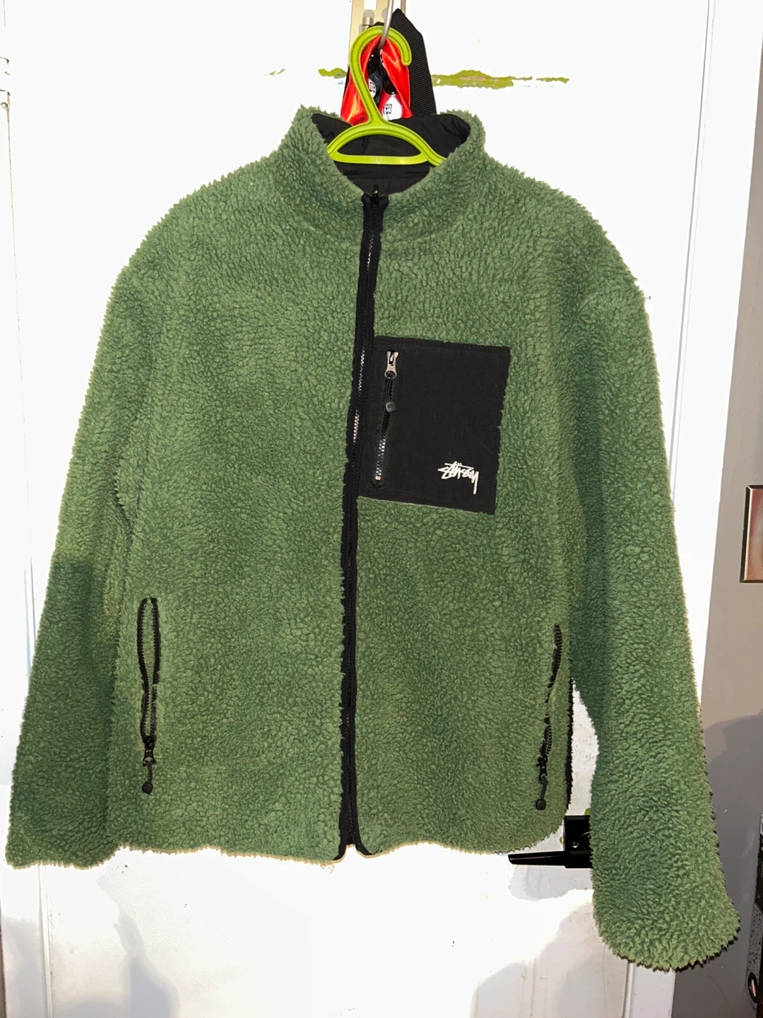 This Stüssy jacket reverses from a black nylon to a fuzzy green sherpa. It features the iconic Stüssy logo on the black side and a large "8 ball" graphic on the green side. Zipper closure and pockets keep your essentials secure. It's a great piece for staying warm and stylish!