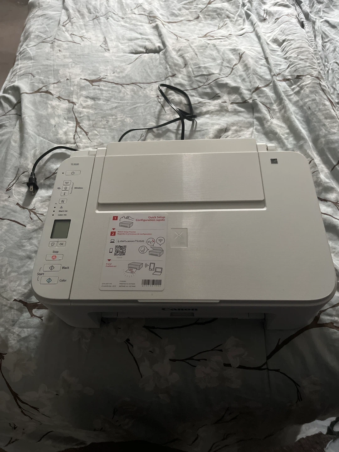 This is a white Canon TS3320 All-in-One printer. It supports wireless connectivity. It prints, scans, and copies documents.
