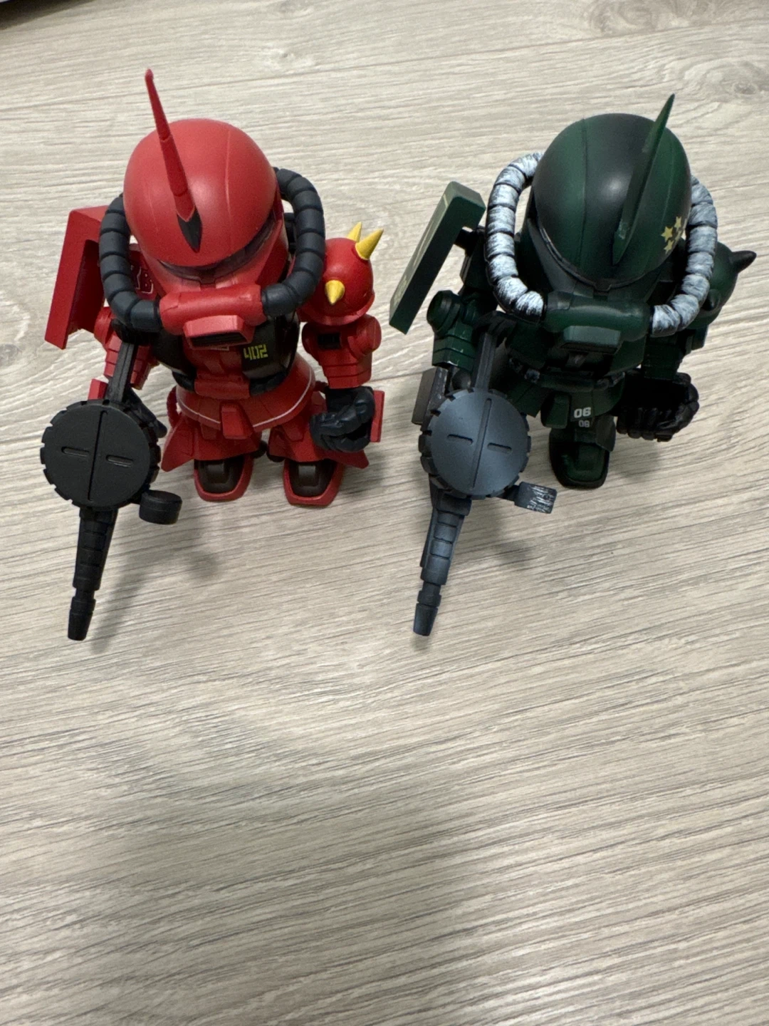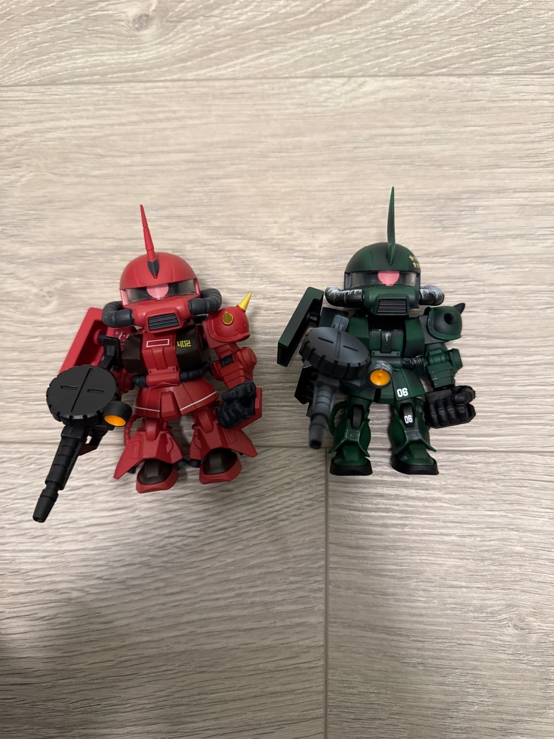 Two collectible SD/EX-Standard Zaku II figures, one red and one green. These are stylized, chibi-like models with weapons. Perfect for any Gundam enthusiast or collector! $40 each or take both for $60.