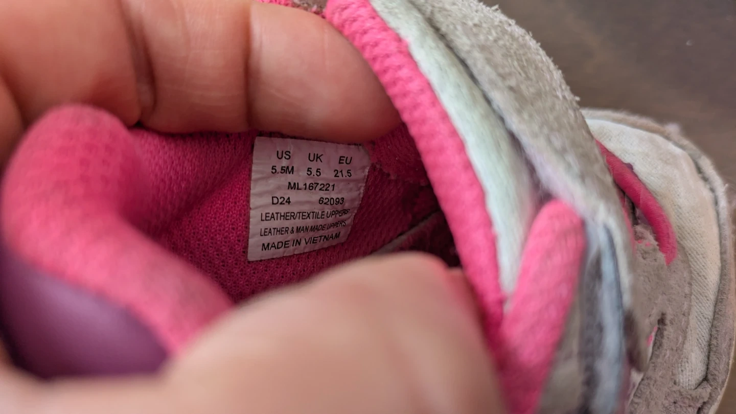 These Merrell kids' shoes are a size 5.5 M (21.5). They feature a combination of leather and textile uppers.