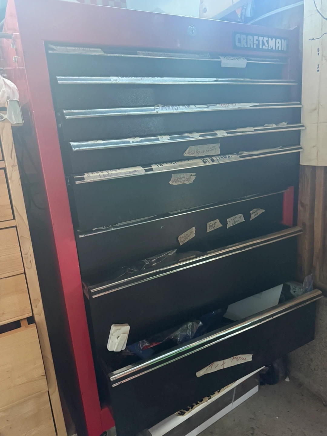 Craftsman 5 drawer tool chest for sale. It's red and black, perfect for organizing your tools. This chest has multiple drawers for ample storage.