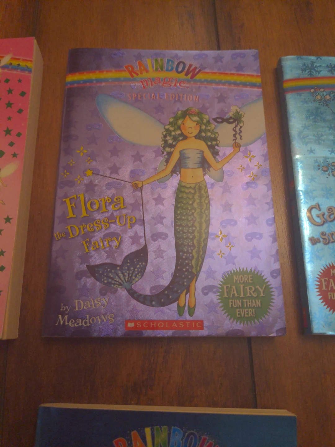 This lot includes five Rainbow Magic Special Edition fairy books by Daisy Meadows. Titles are The Jewel Fairies, Flora the Fairy, Gabriella the Snow Kingdom Fairy, Stella the Star Fairy, Brianna the Tooth Fairy, and Selena the Sleepover Fairy. These books are published by Scholastic.