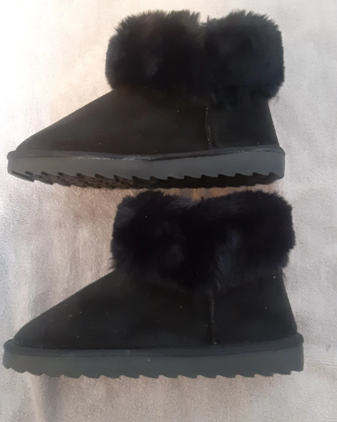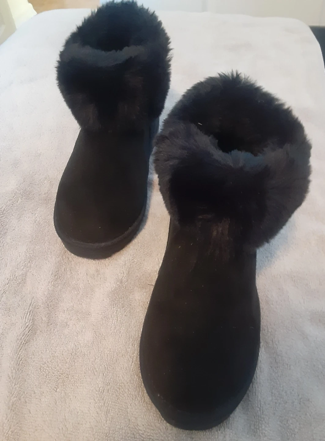 Comfortable black boots with a soft fur trim. They're a size 8 and made with a suede-like material. The sole has a good grip pattern.