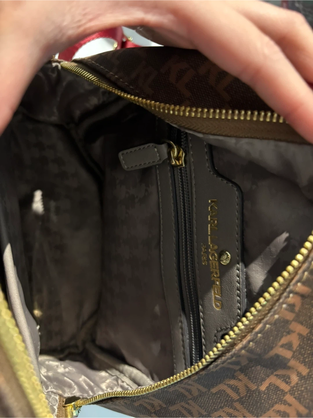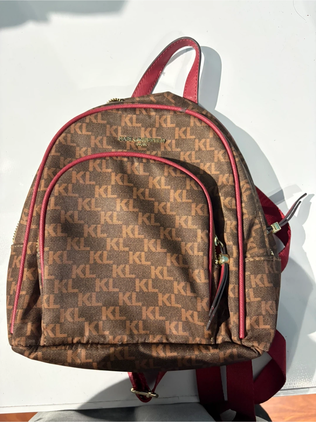 A stylish Karl Lagerfeld Paris backpack in a brown signature KL print. It features red trim and adjustable straps. Interior includes a zippered pocket.