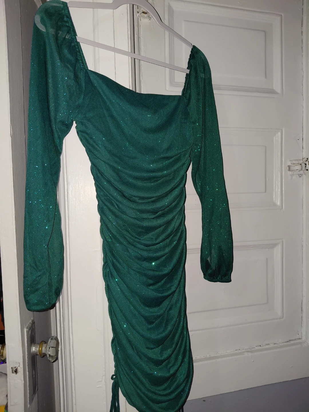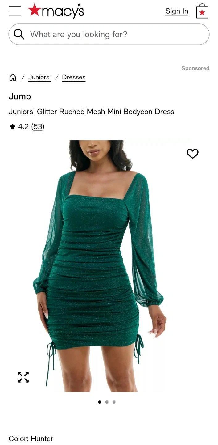 Selling a Jump Juniors' Glitter Ruched Mini Bodycon Dress in hunter green. This dress features a square neck and long sleeves with a ruched bodycon fit. Originally bought for $79