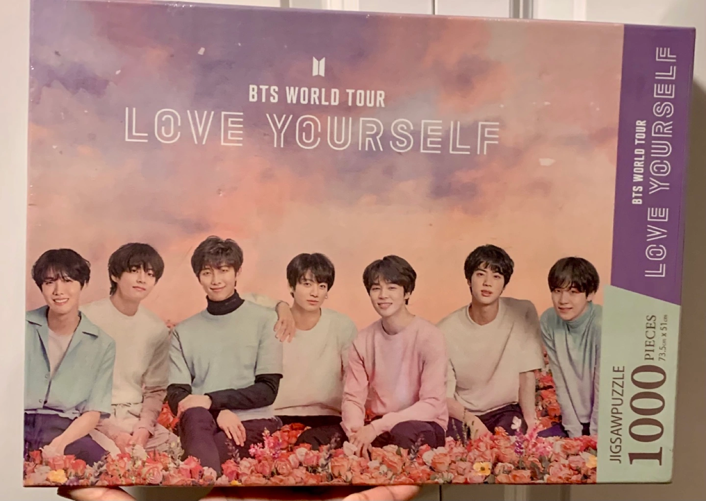 1000-piece jigsaw puzzle. Features the band BTS. Love Yourself World Tour theme. 73.5cm x 51cm. NEW SEALED!