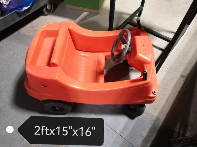Zoom into fun with this used Little Tikes Cozy Coupe car, perfect for toddlers ready to roll! This classic ride-on features a durable plastic body, a steering wheel with a working horn, and a high seat back for support, ensuring hours of imaginative play. It is in used condition, showing some signs of wear, but it's ready for new adventures. Here are the approximate dimensions: