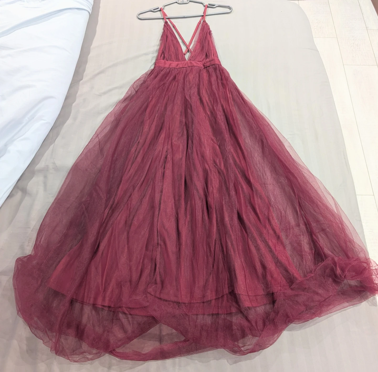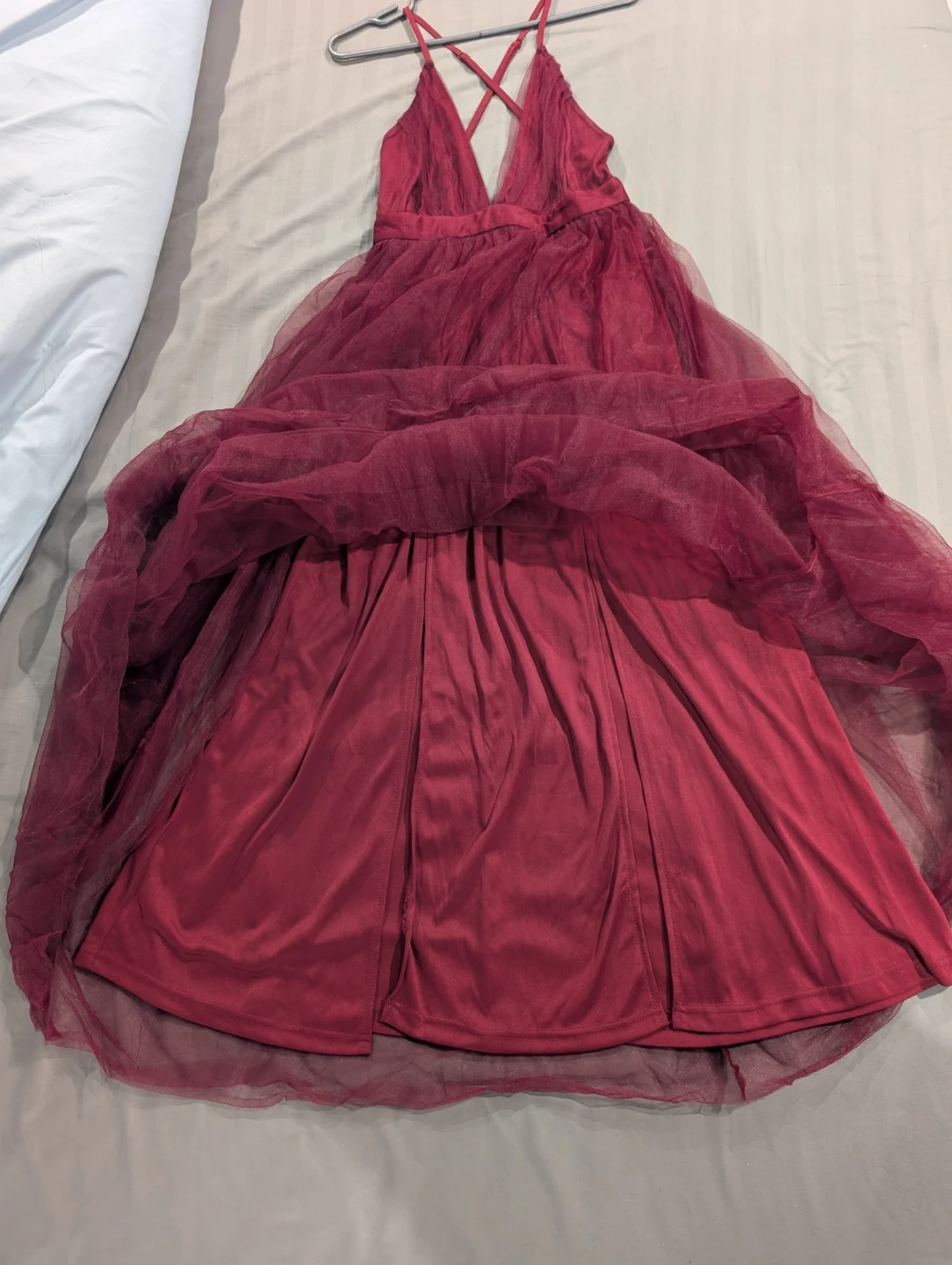 gown features a deep V-neckline and criss-cross spaghetti straps. It's made of a shimmering burgundy satin-like material with a flowing tulle overlay. Size S (US 4).