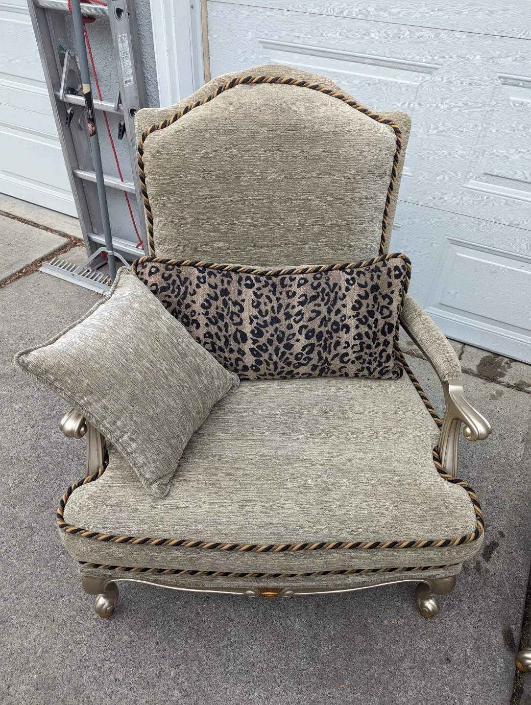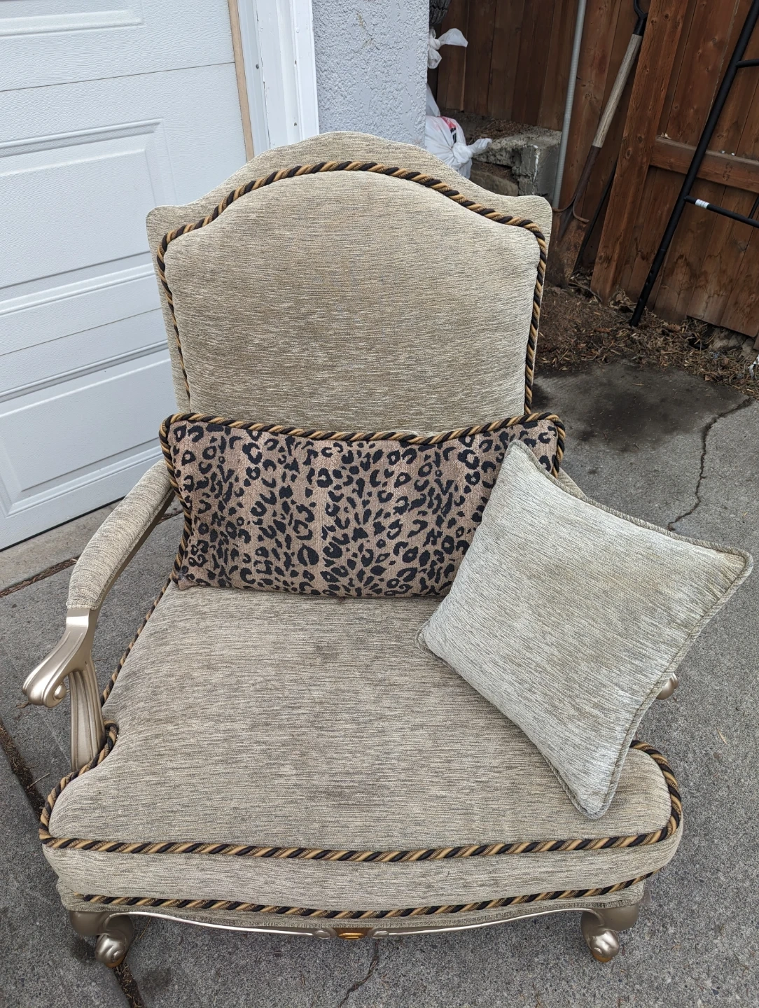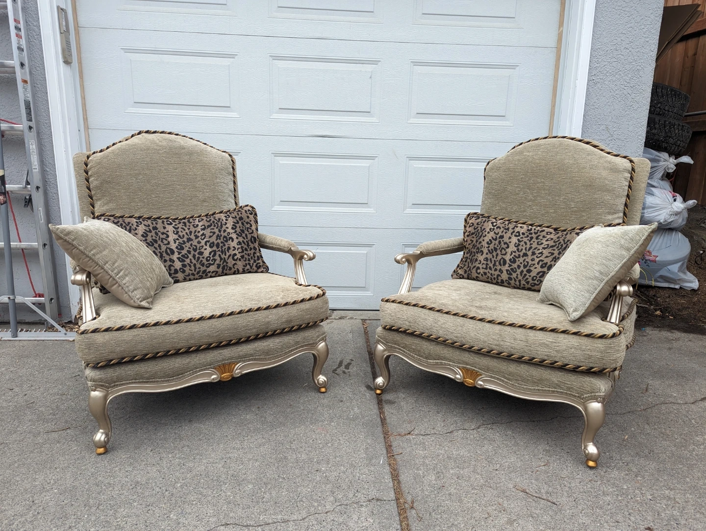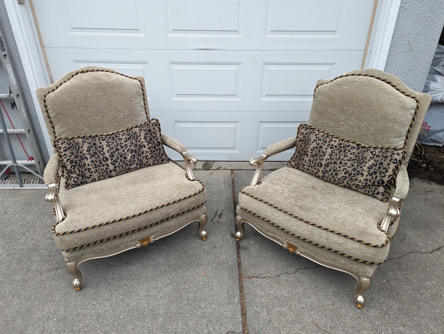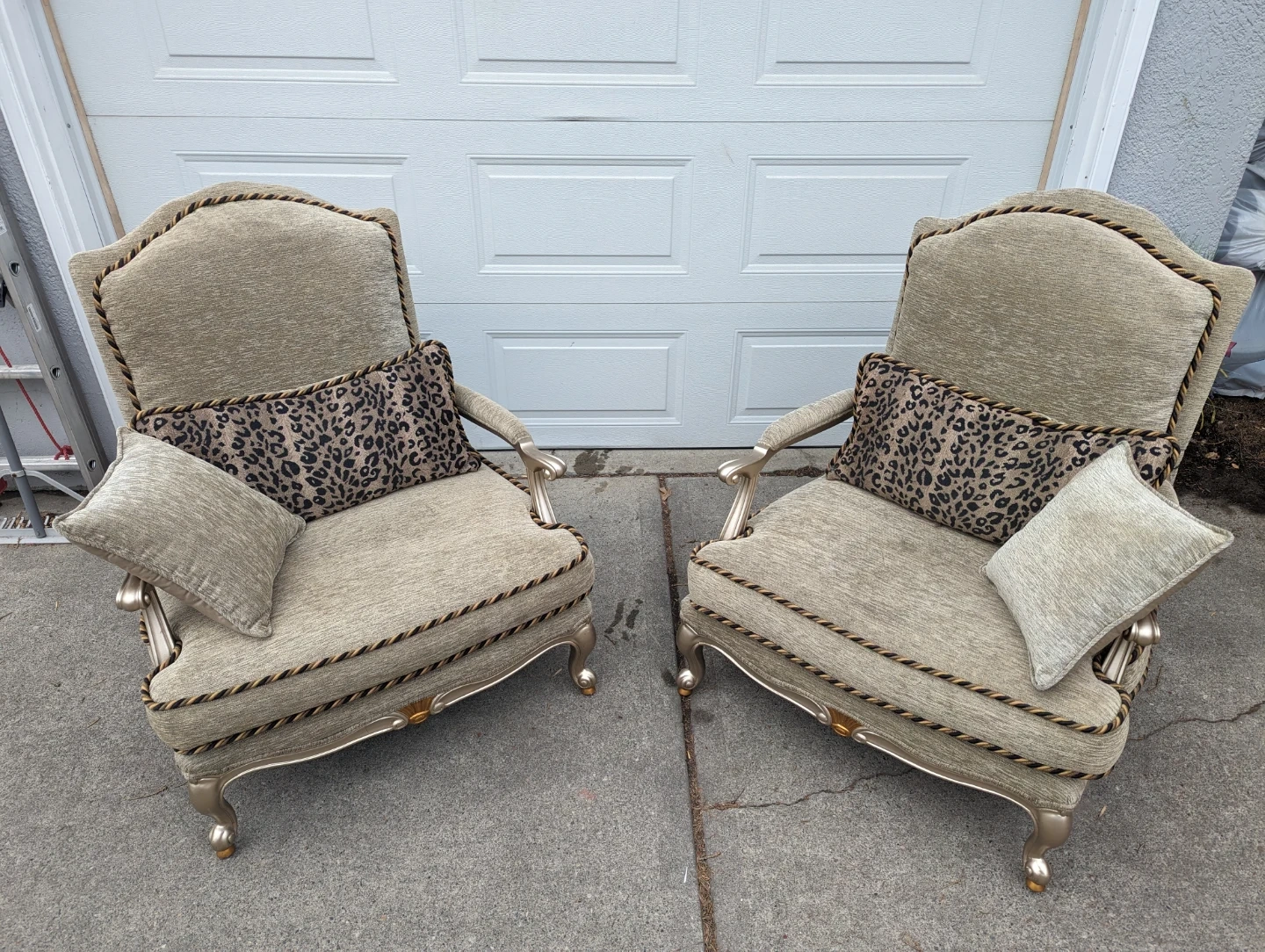 A pair of elegant accent chairs upholstered in a textured light gold fabric. They feature ornate trim and come with decorative pillows, including one with a leopard print. These chairs would add a touch of style to any living space.
