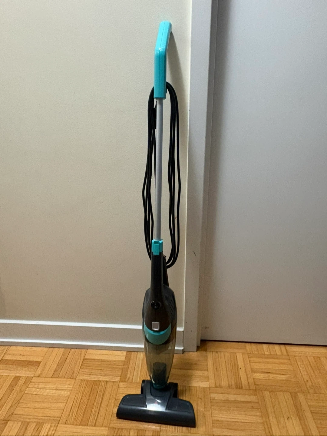 Lightweight stick vacuum cleaner in black and teal. It's designed for quick cleanups and has a dustbin for easy disposal. Perfect for smaller spaces or quick tidying up!