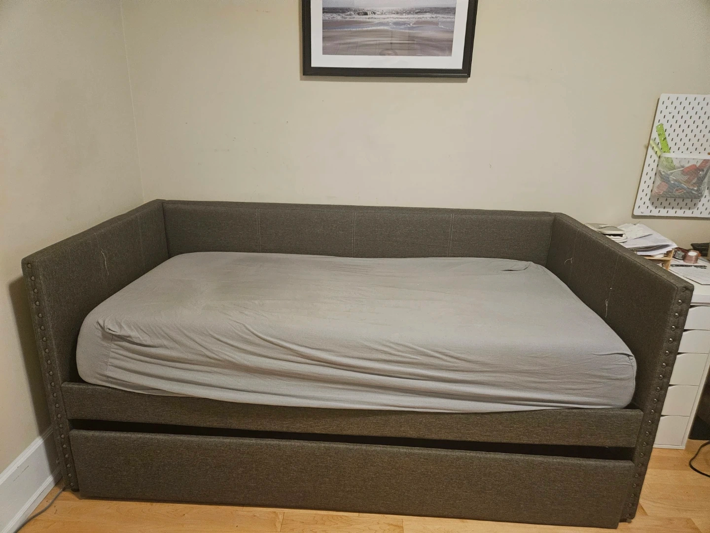 Gray daybed with a trundle hidden other bed.