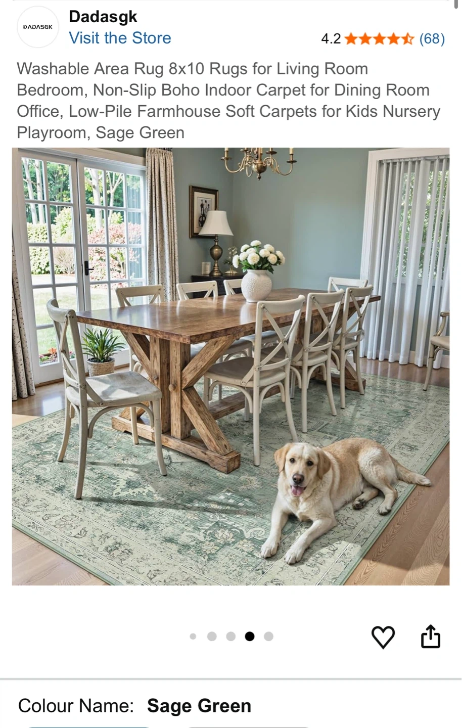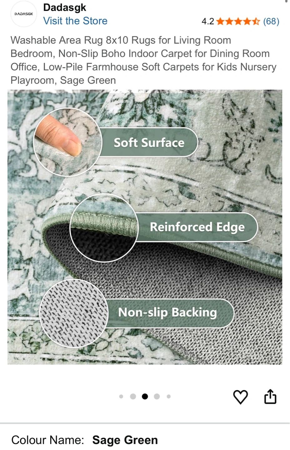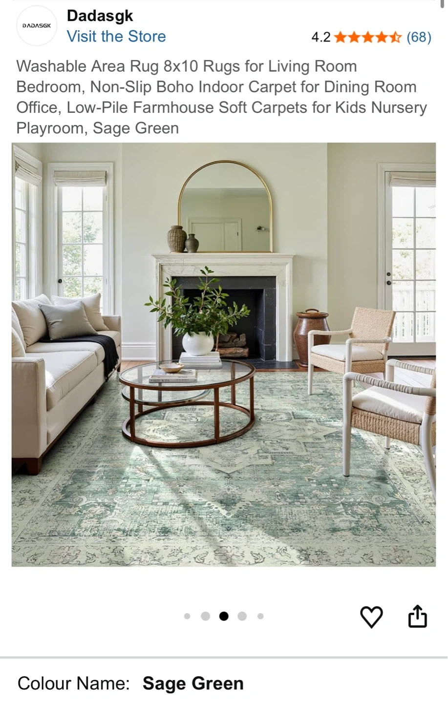 This washable area rug is 8x10 and comes in a sage green colour. It's low-pile and suitable for various rooms. Pet and kids friendly!