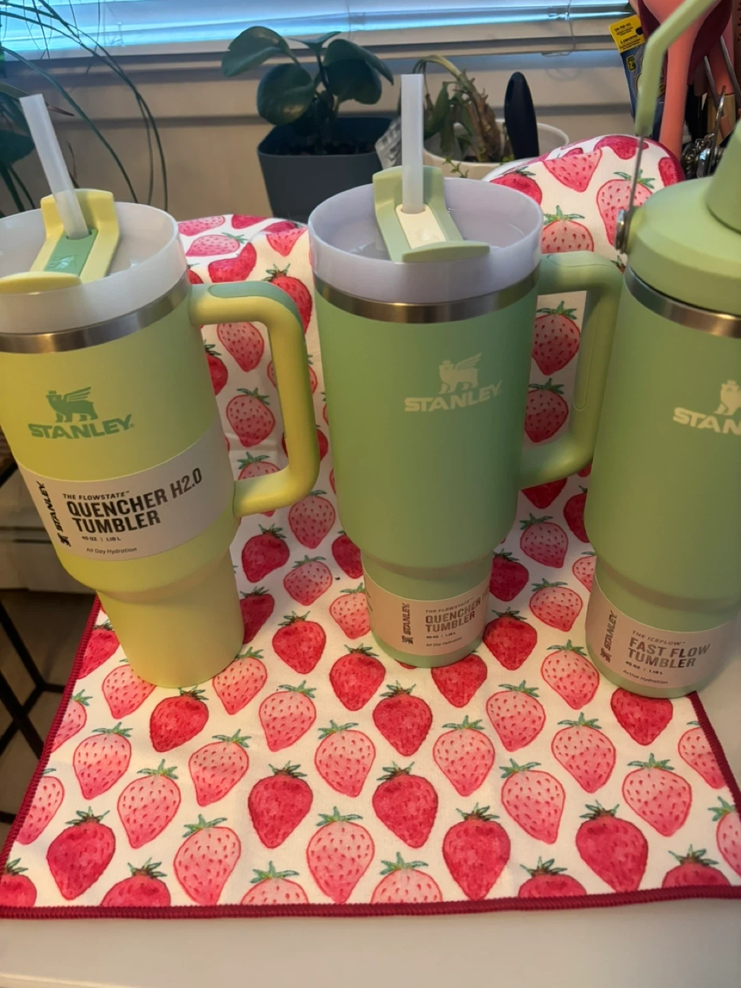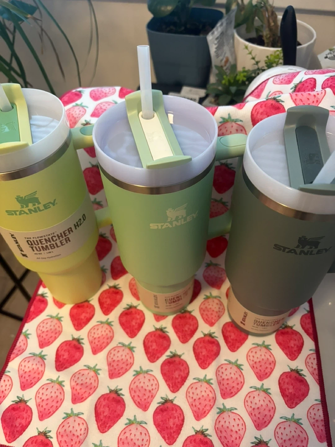 Set of three Stanley Quencher H2.0 tumblers in assorted pastel colours. Each tumbler holds 40 oz (1.18 L) and comes with a reusable straw. These are perfect for staying hydrated throughout the day. Easy to clean and durable for everyday use!