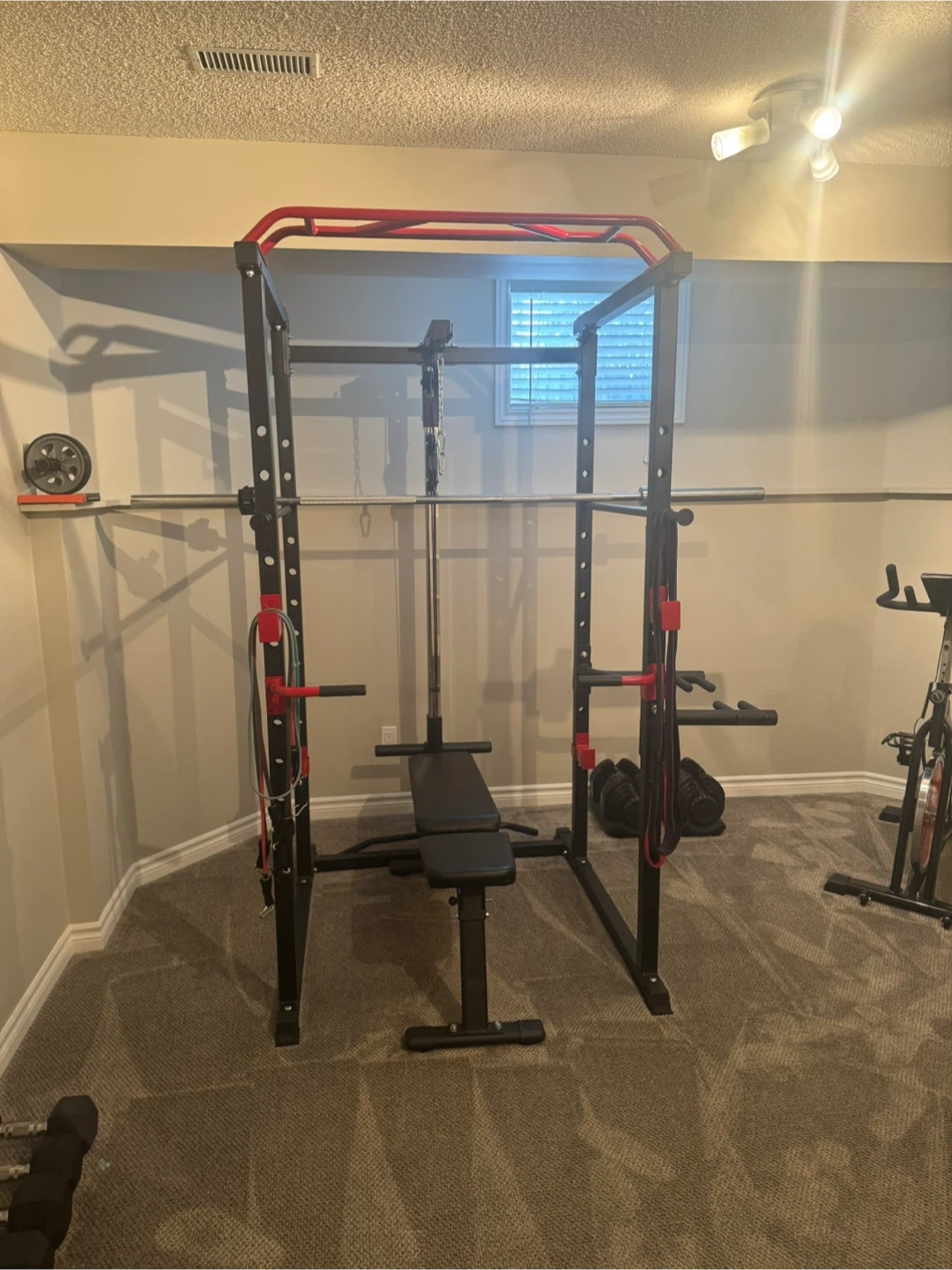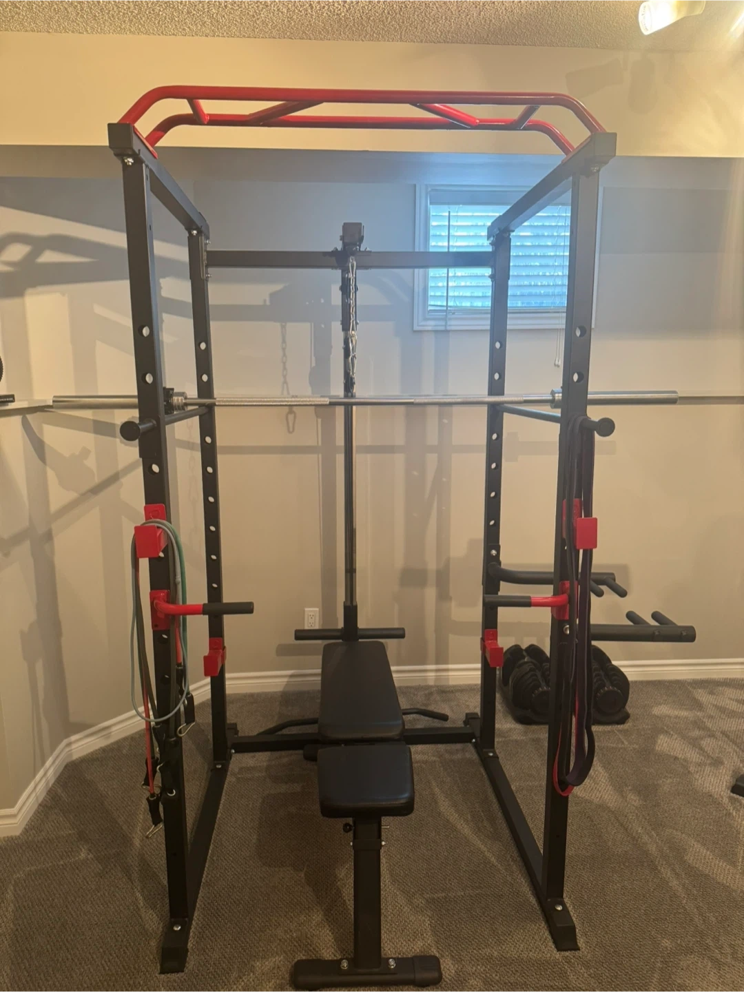 This home power squat rack features a durable metal frame and multiple attachment points. It's suitable for a wide range of strength training exercises.