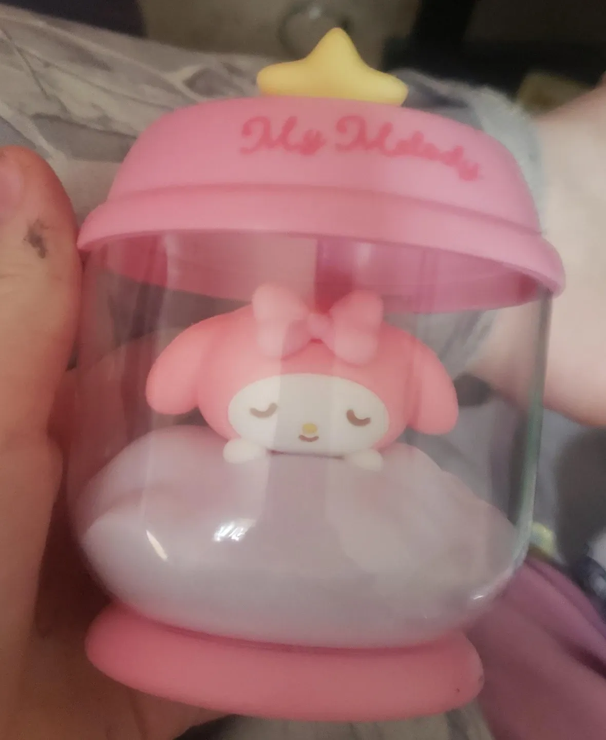 Cute My Melody night light with a sleeping character on a cloud. It has a star on top and a button on the base. Charging port on the base.