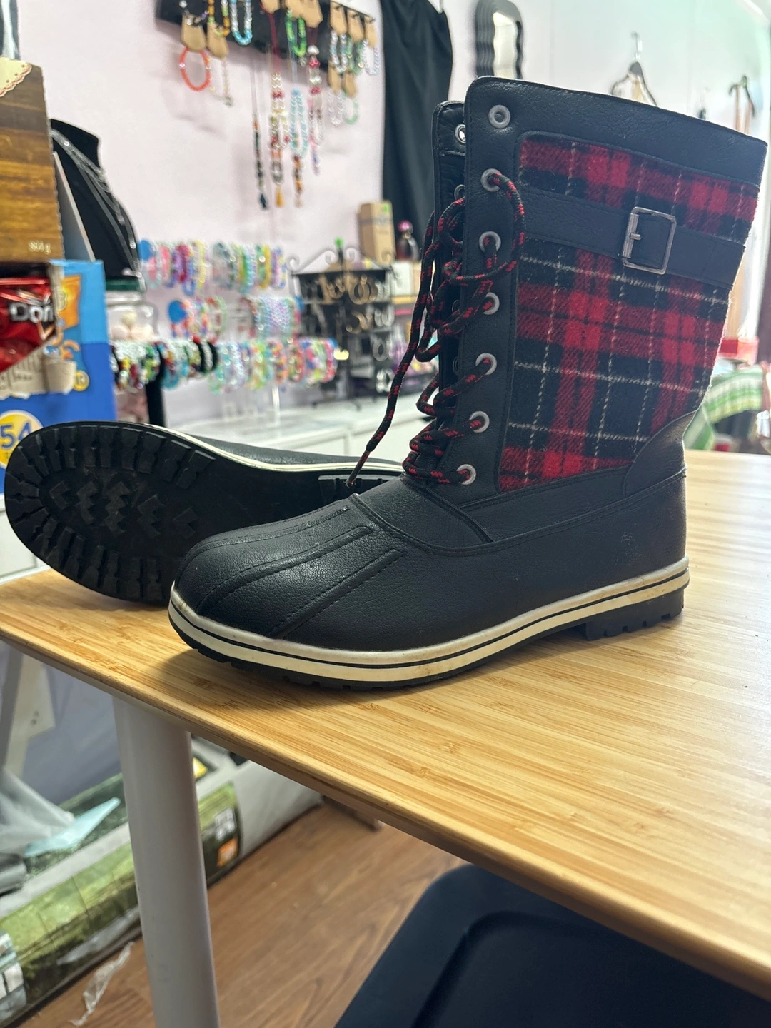 These are some cozy winter boots! They're black with a red and black plaid pattern on the upper part of the boot. Perfect for keeping your feet warm and dry during the winter months.
