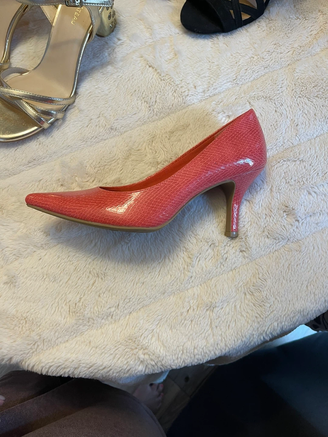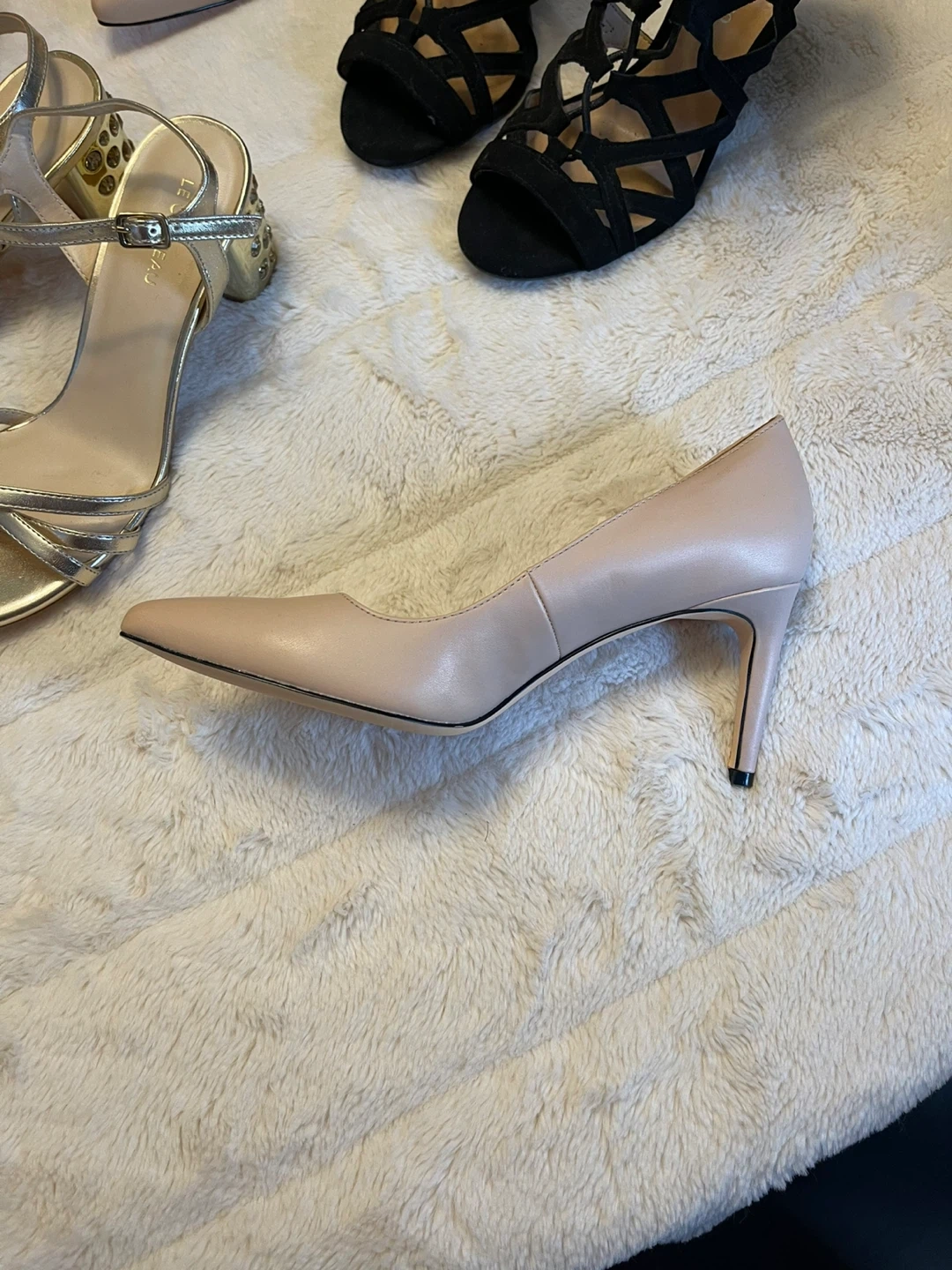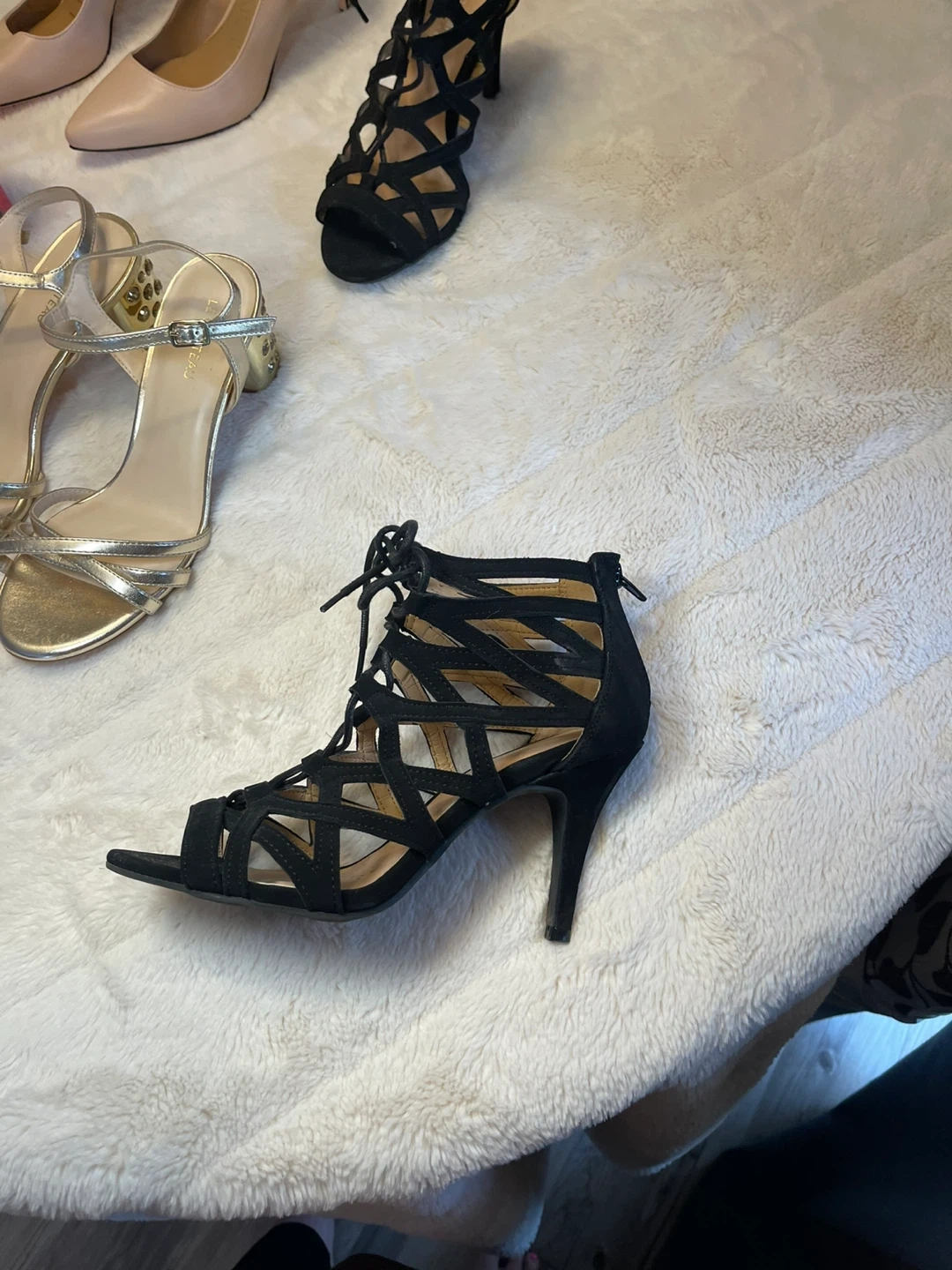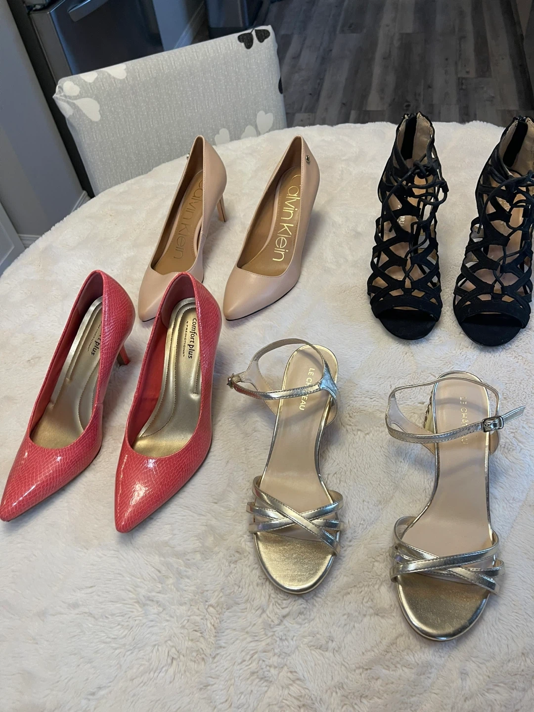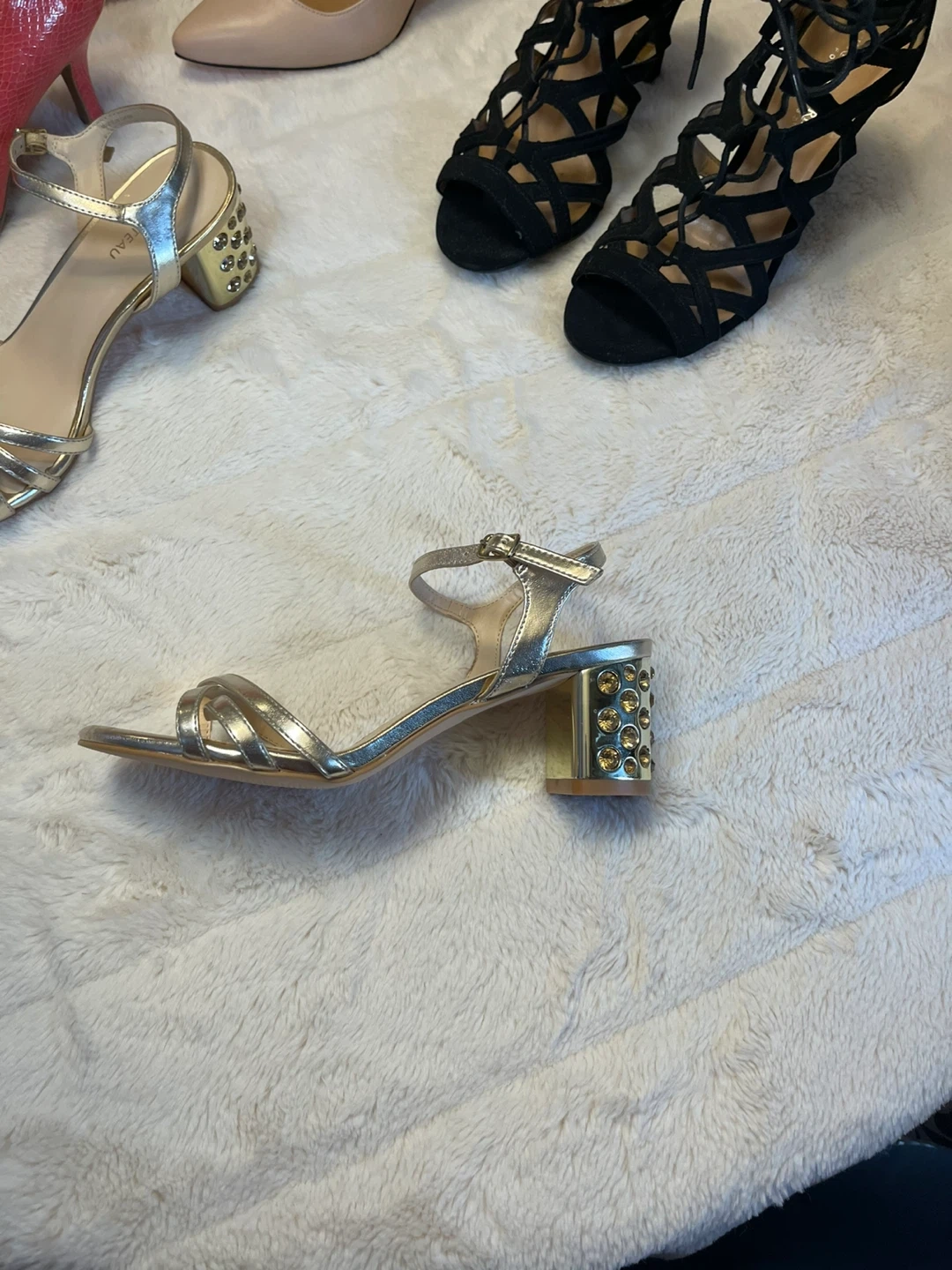 A collection of stylish women's footwear. Includes a pair of gold strappy sandals with decorative block heels. Also features a pair of pink snakeskin-texture pointed-toe pumps and a pair of nude pointed-toe pumps. Black caged lace-up heeled sandals are also included. Perfect for dressing up any outfit! Size 7.