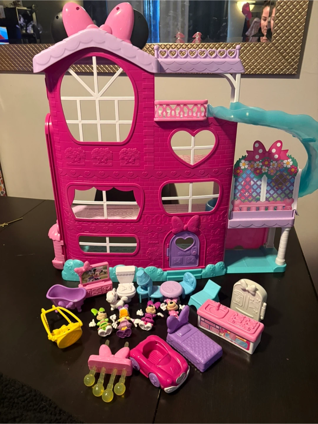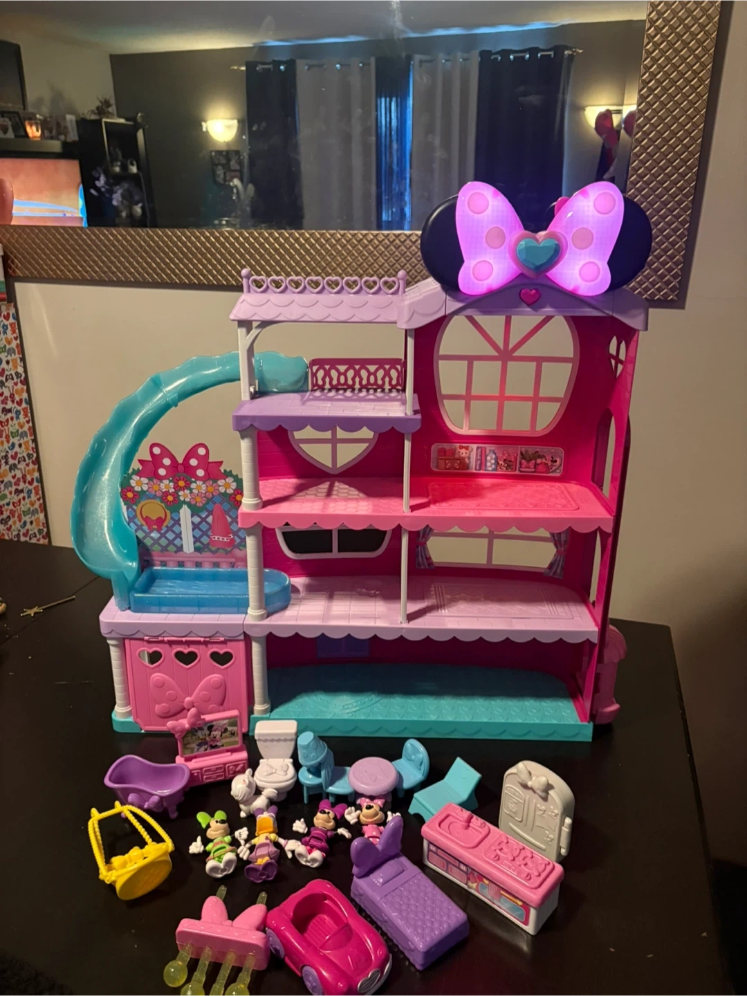 This Disney Junior Minnie Mouse Mansion playset is all pink and comes with a slide and accessories. It includes figures, a car, furniture, and a bathtub. It's a fun toy for kids who love Minnie Mouse! With lights and sounds! In great condition ready for a new adventure!!