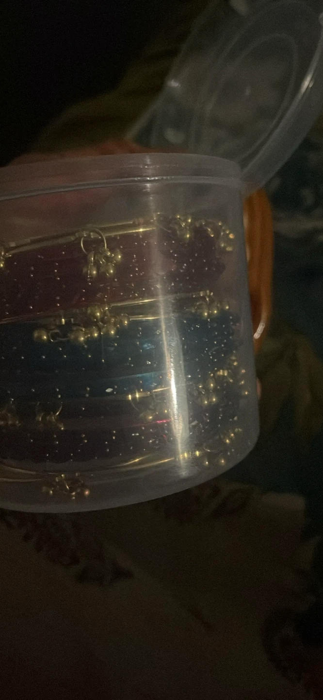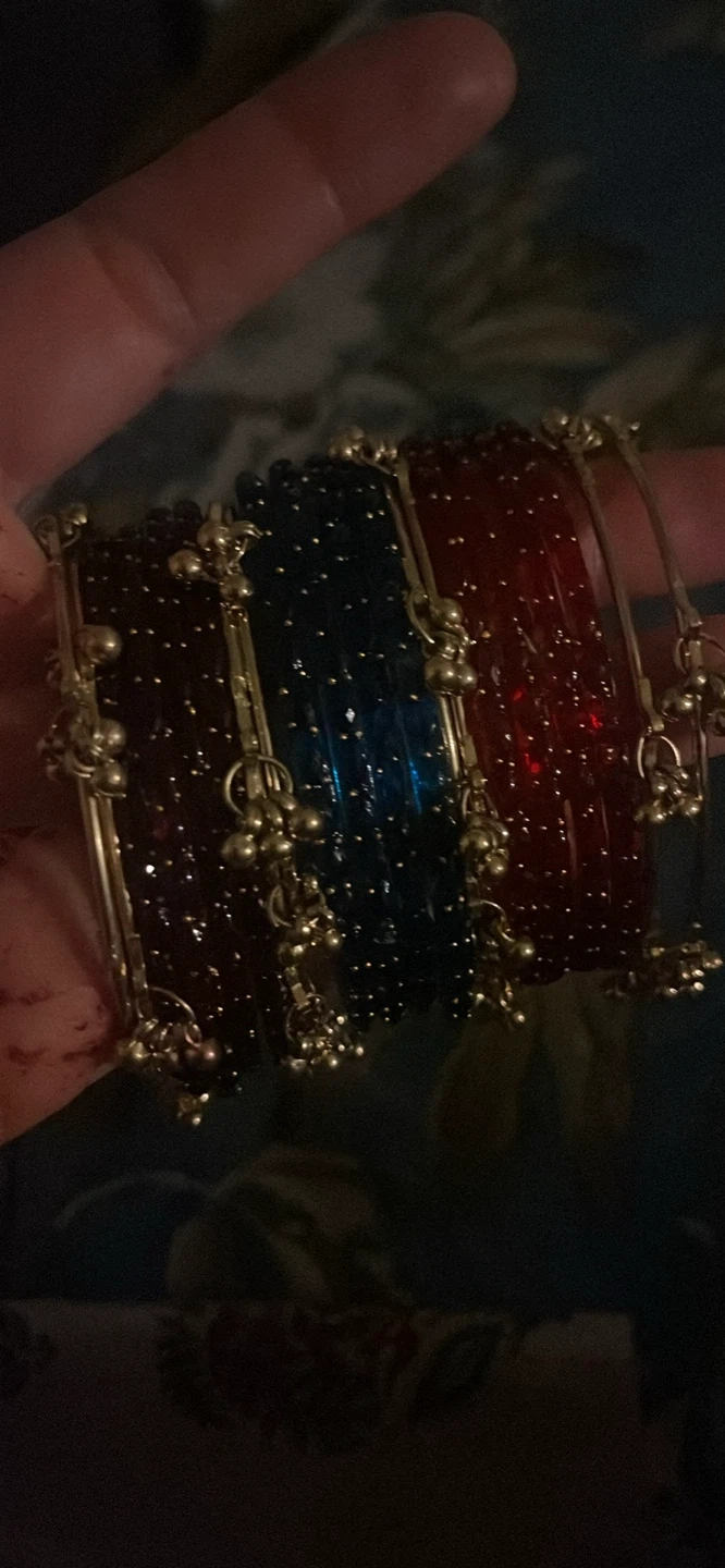 Set of three bangles in red, blue, and deep red/maroon colours. Each bangle features small gold-toned charms that jingle. These are made of a beaded material with a metal frame. Comes in a plastic container.
