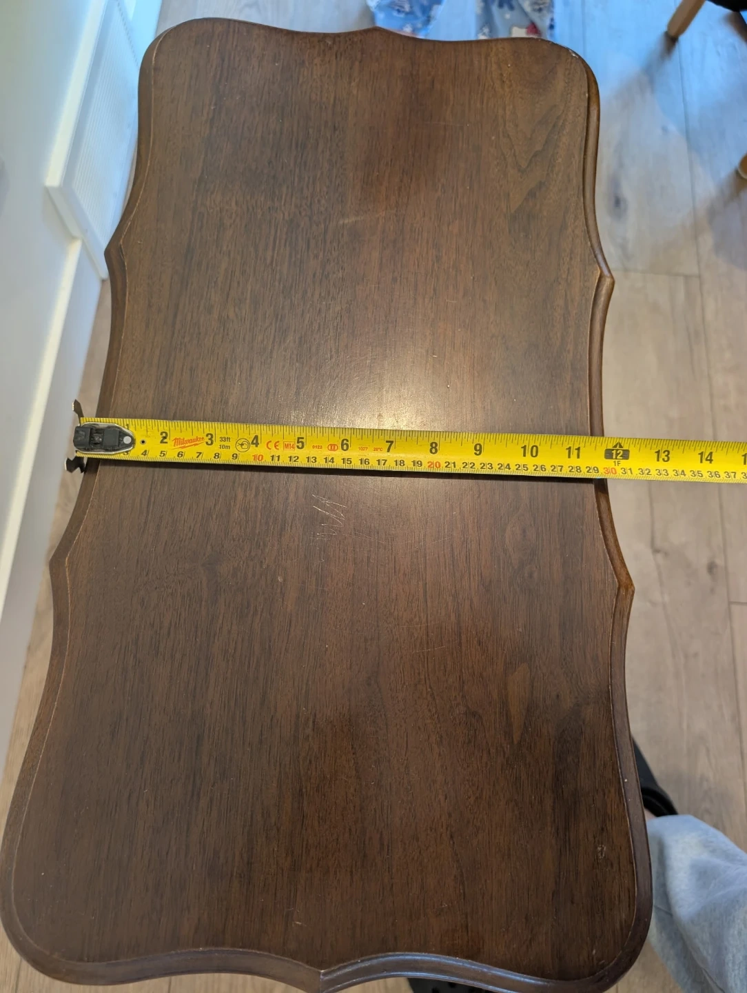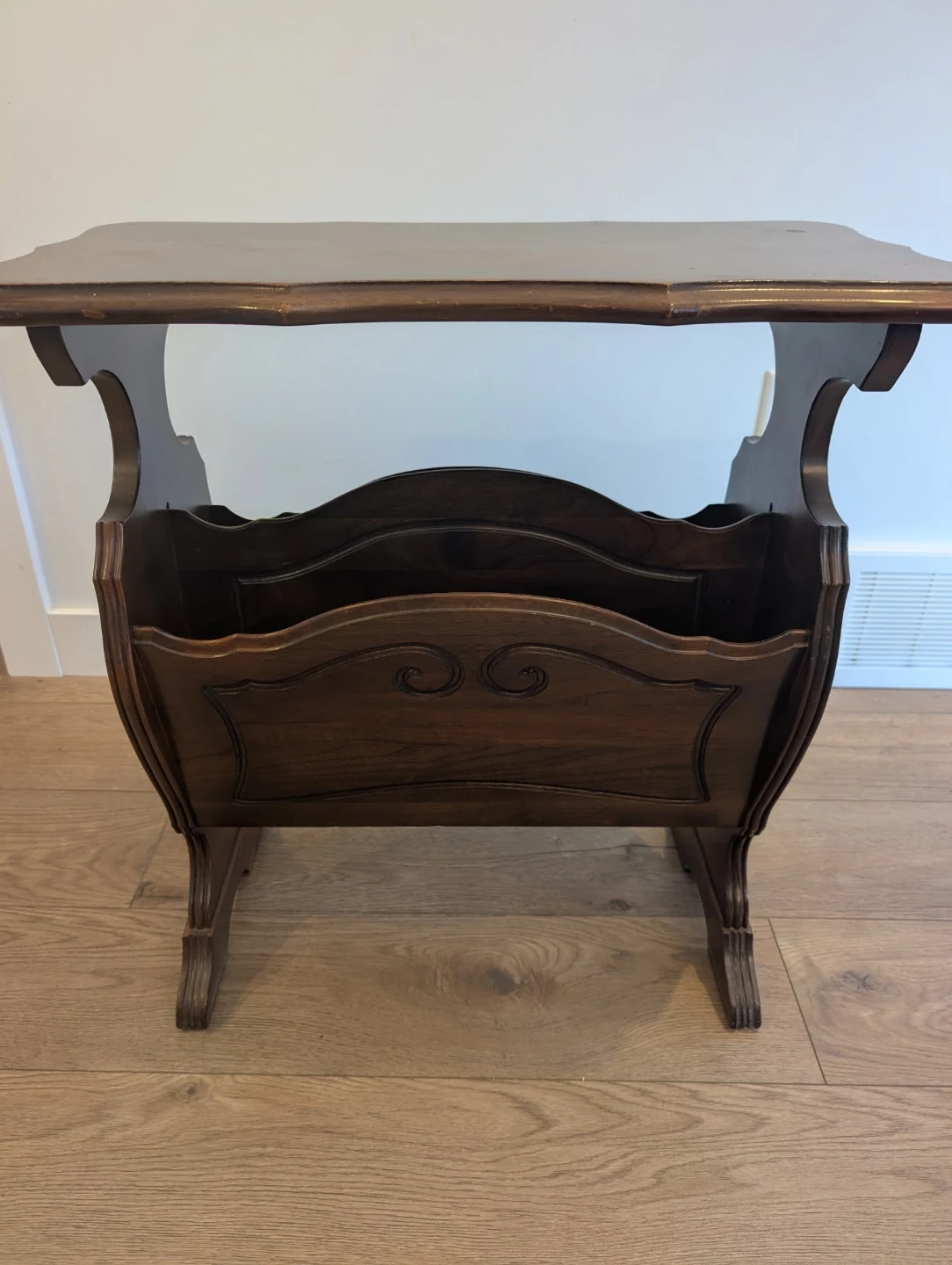 A dark wood magazine rack with a table top. It's approximately 16 inches wide and 23 inches tall. The design includes decorative carvings on the front panel.
