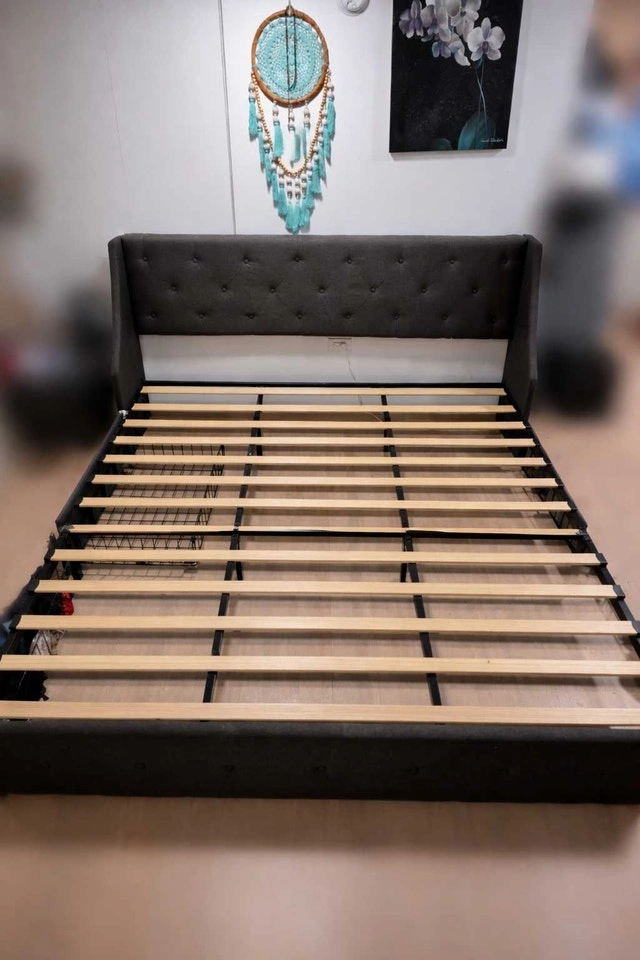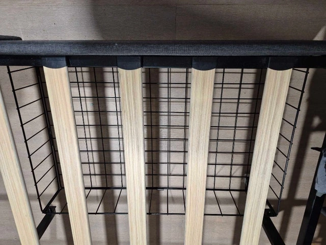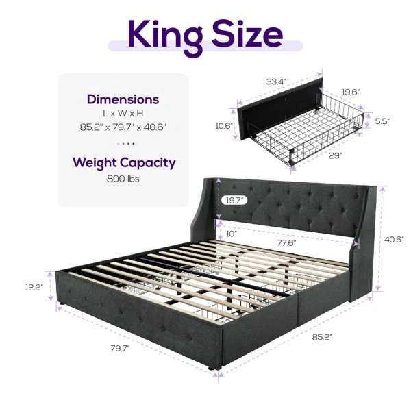 Metal bed frame with wooden bed slats. King size. Includes 4 under-drawers. Weight limit: 800lb. Dimensions shown in pictures.