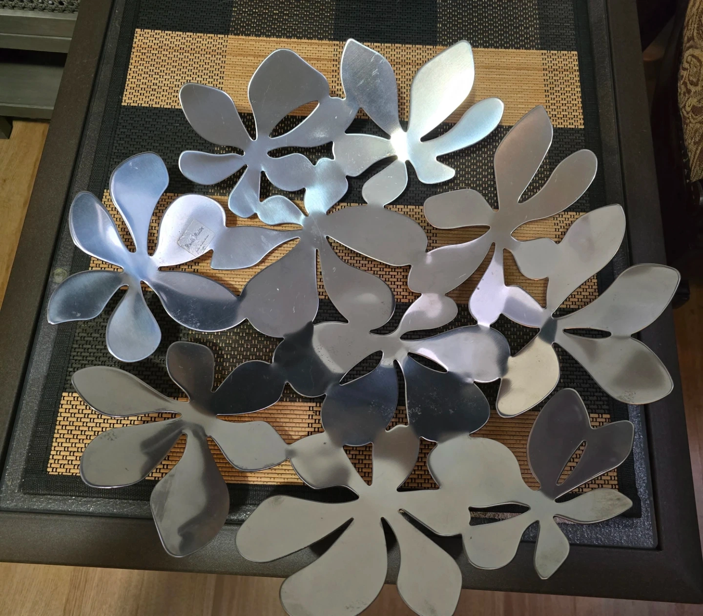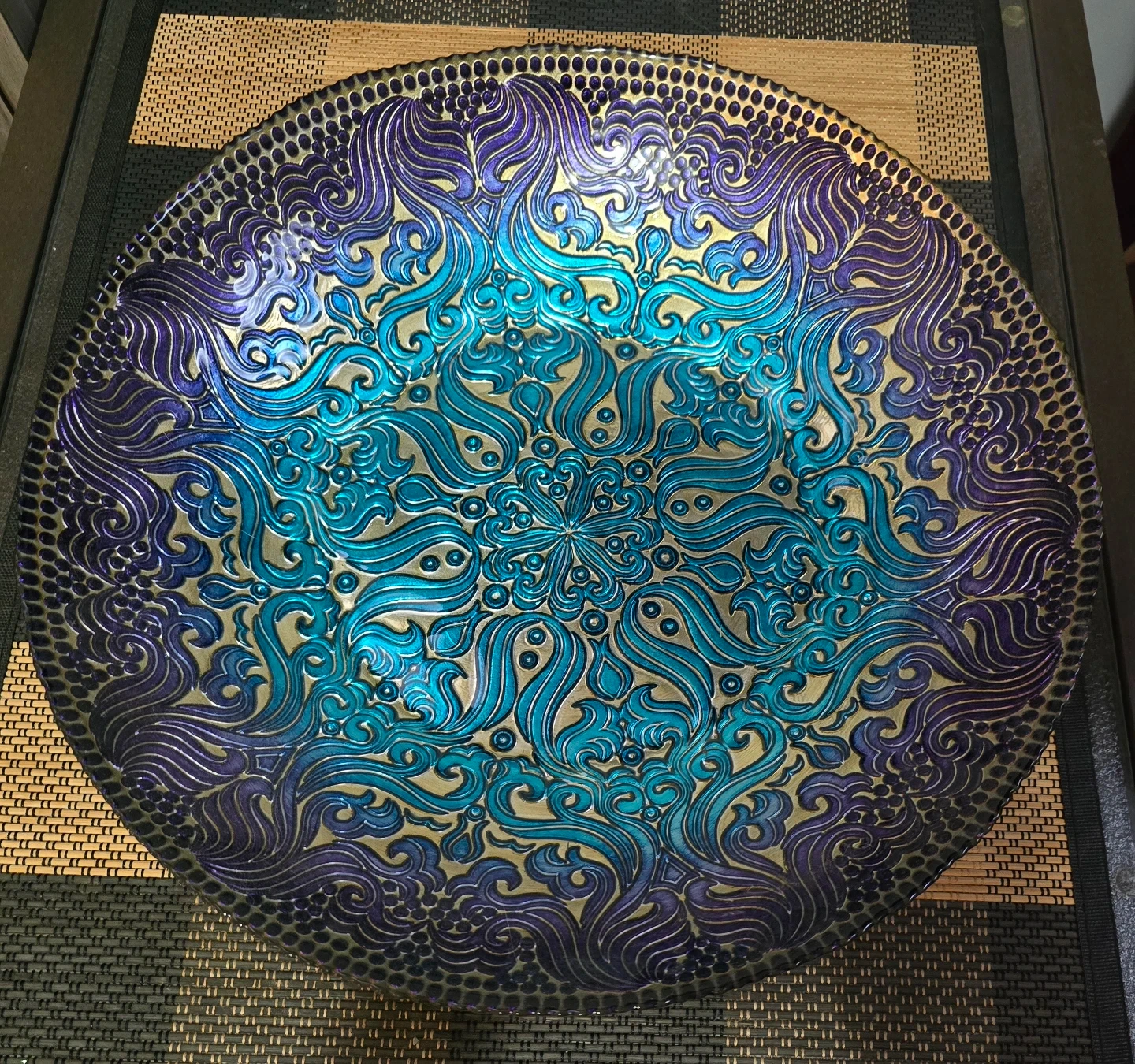 This is a beautiful glass bowl with an intricate mandala-like pattern in shades of blue and purple, accented with gold. It's perfect for displaying on a table or shelf as a decorative piece. Made of glass.