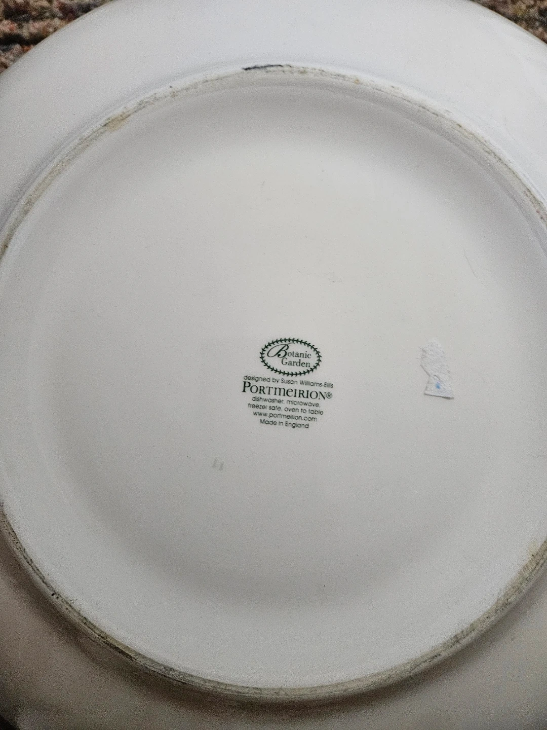 This is a Portmeirion Botanic Garden large plate featuring a butterfly and lilac design. It's made in England and is dishwasher, microwave, and freezer safe. Measures approximately 10.5 inches in diameter.