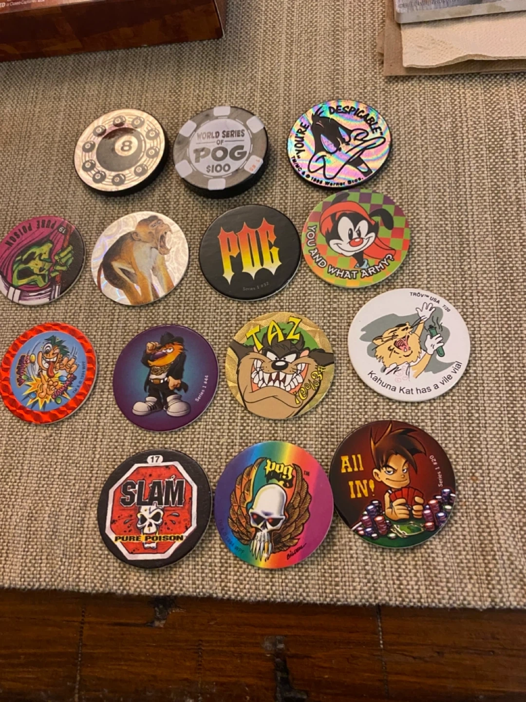 This is a collection of various POGs and slammers, featuring popular characters and designs like Looney Tunes and World Series of POG. Includes a '$100' World Series of POG and several uniquely illustrated POGs. These collectible discs are great for any POG enthusiast!