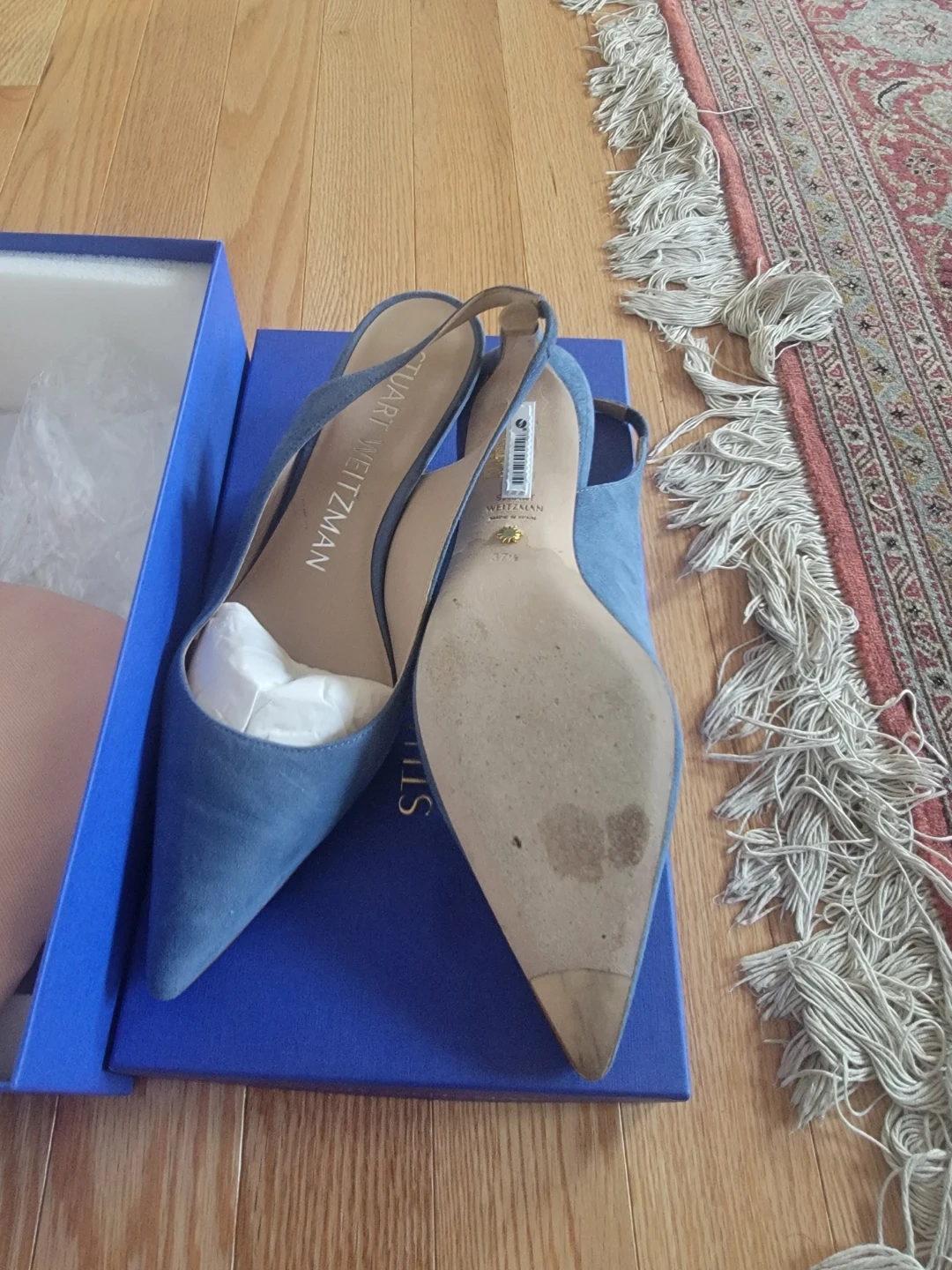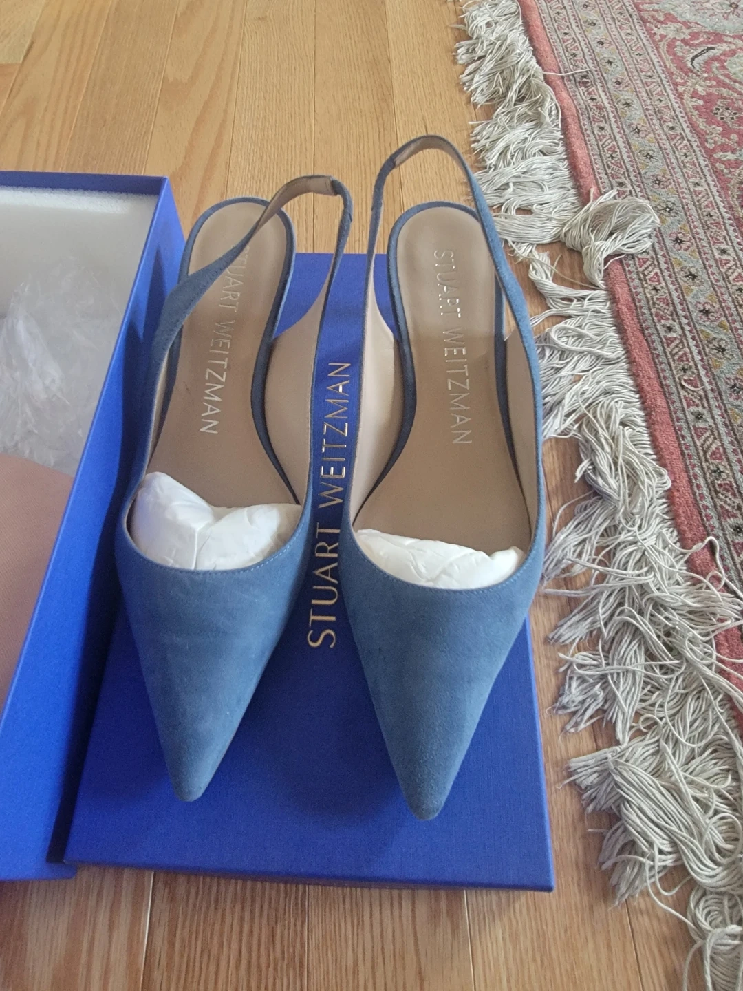 Stuart Weitzman blue suede slingback heels. These stylish shoes are made with a pointed toe and delicate slingback straps. They come in the original box with a dust bag.