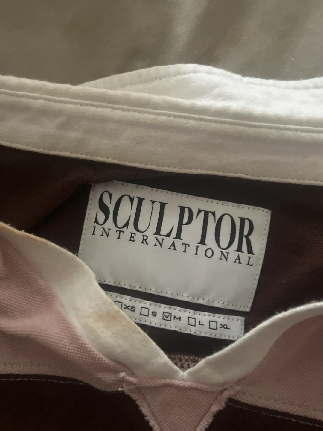 Selling a cute Rugby Striped Polo Jersey from Sculptor! It's a size M and features a stylish pink and brown colour palette. Perfect for adding a touch of sporty chic to your wardrobe.