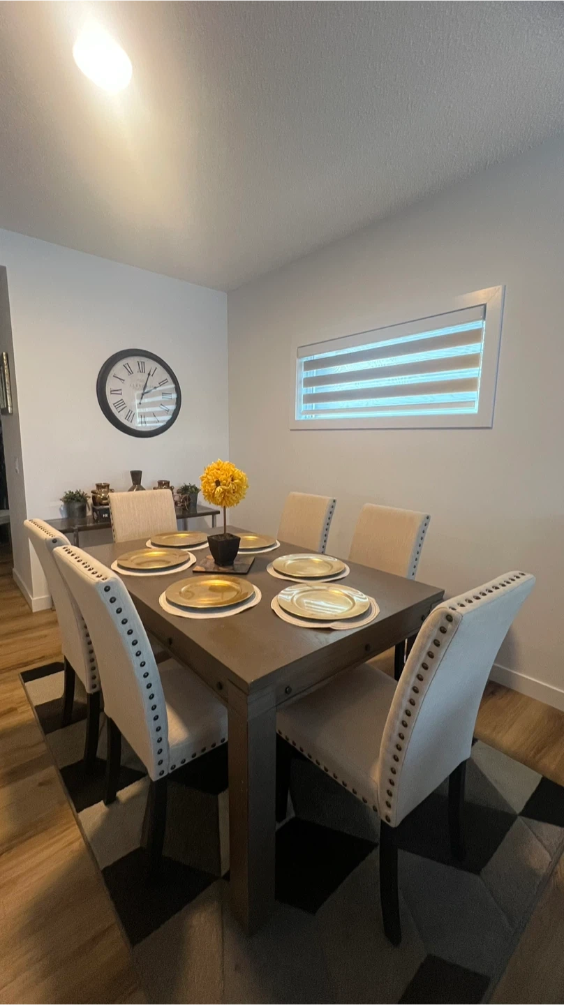 Set of six dining chairs upholstered in a taupe linen-look fabric. Features decorative nailhead trim along the seat and backrest. Dark espresso finished wooden legs provide sturdy support. These chairs would be suitable for a dining room or kitchen area.