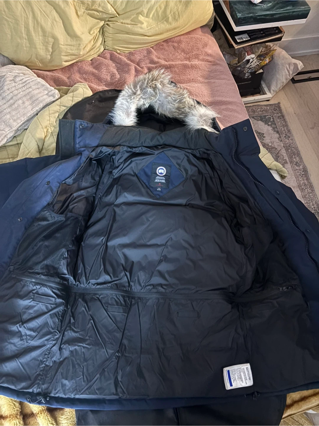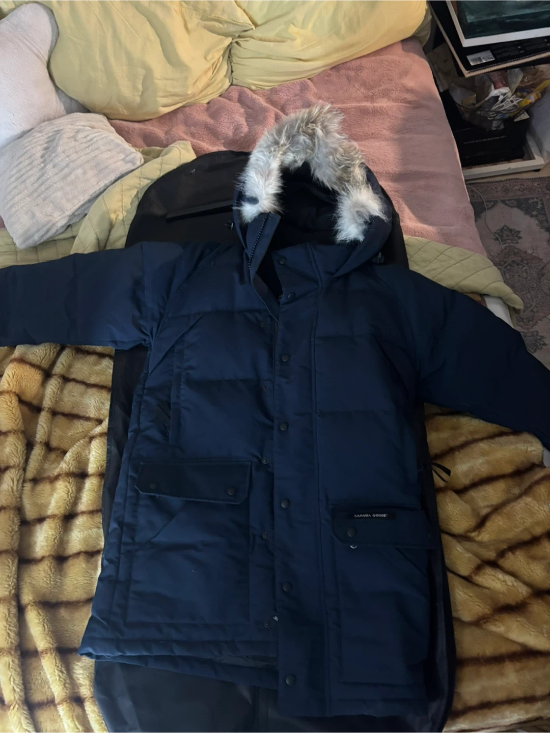 Selling a Canada Goose parka in navy blue. It's in great condition and ready to keep you warm this winter! The jacket features a fur-trimmed hood and multiple pockets for storage, never used practically brand new, size medium