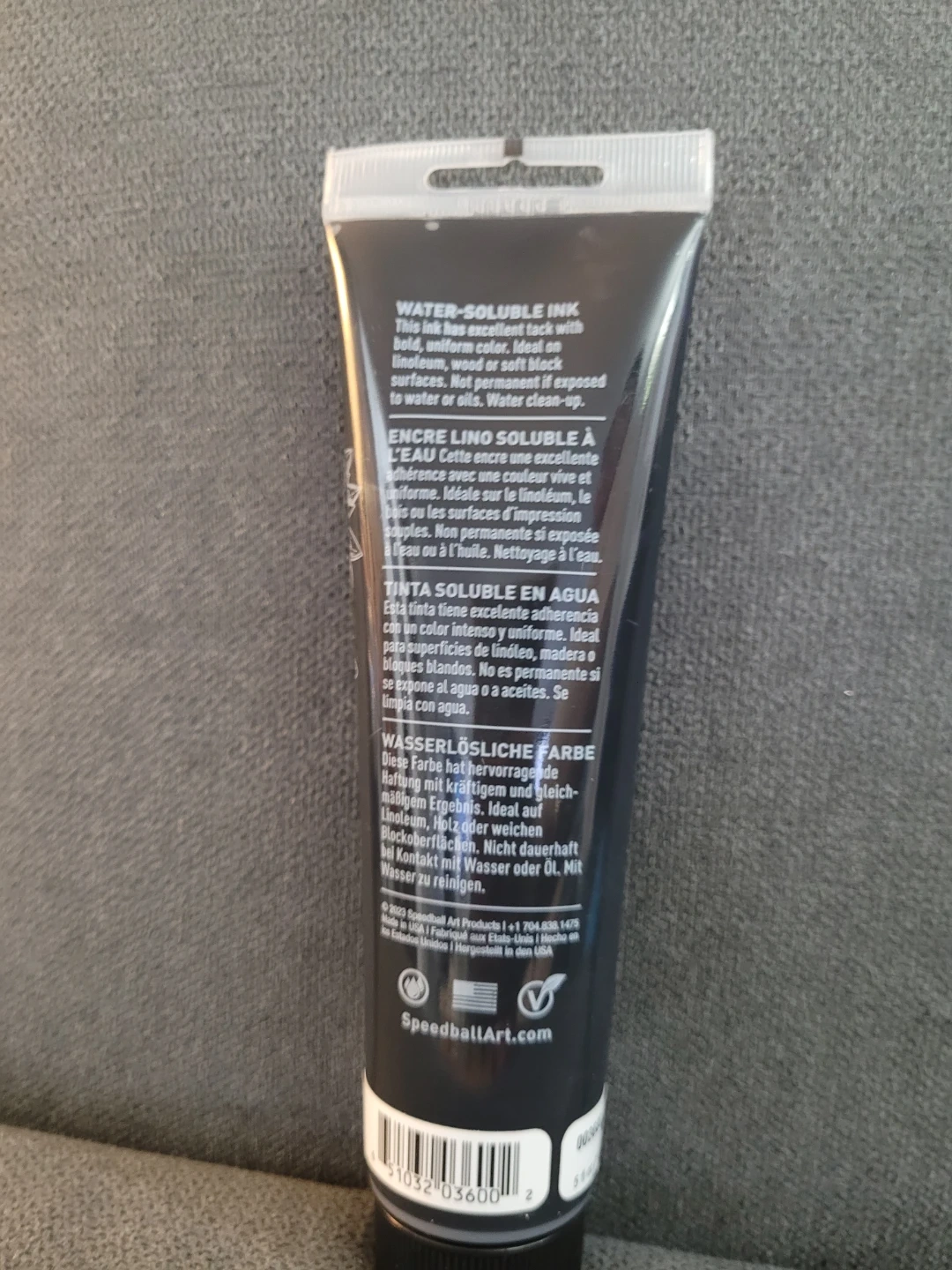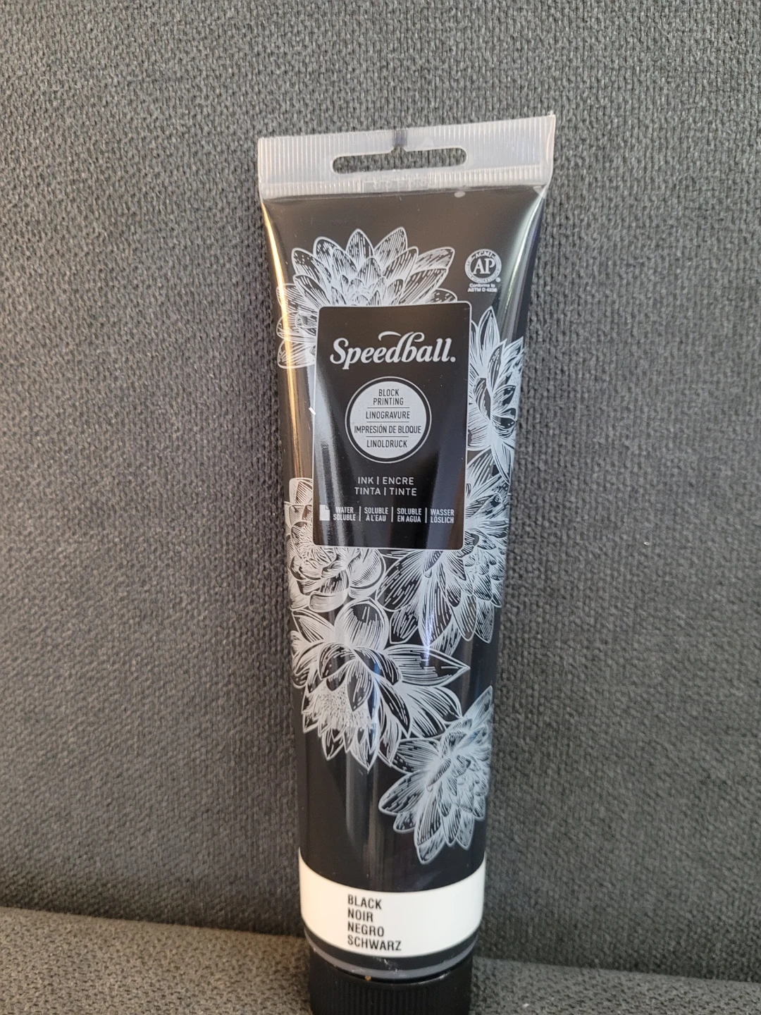 This is a Speedball water-soluble block printing ink in black. It has excellent tack with uniform colour and coverage. It's suitable for block printing and cleans up with water.