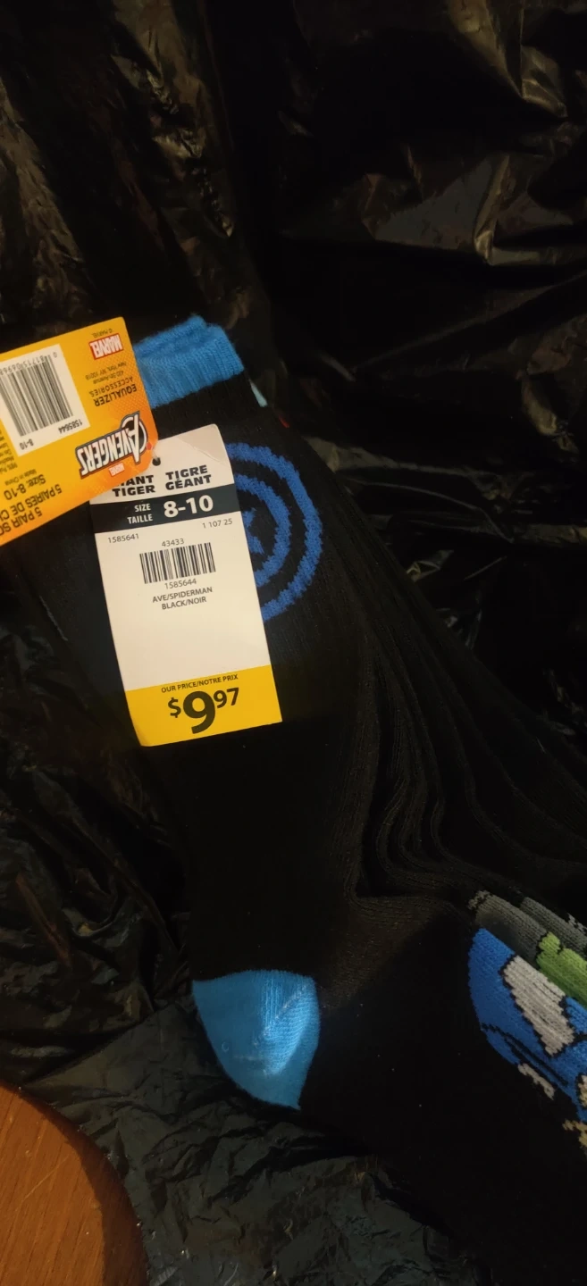 A 5-pair pack of Marvel Avengers themed socks. Size is 8-10. Features characters like Captain America and Hulk.Will not hold for more than 7 days