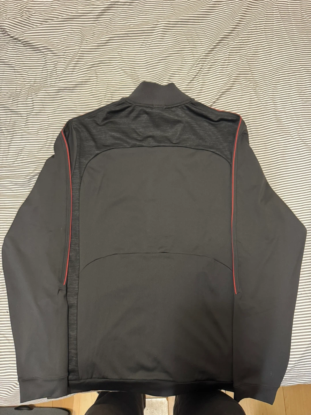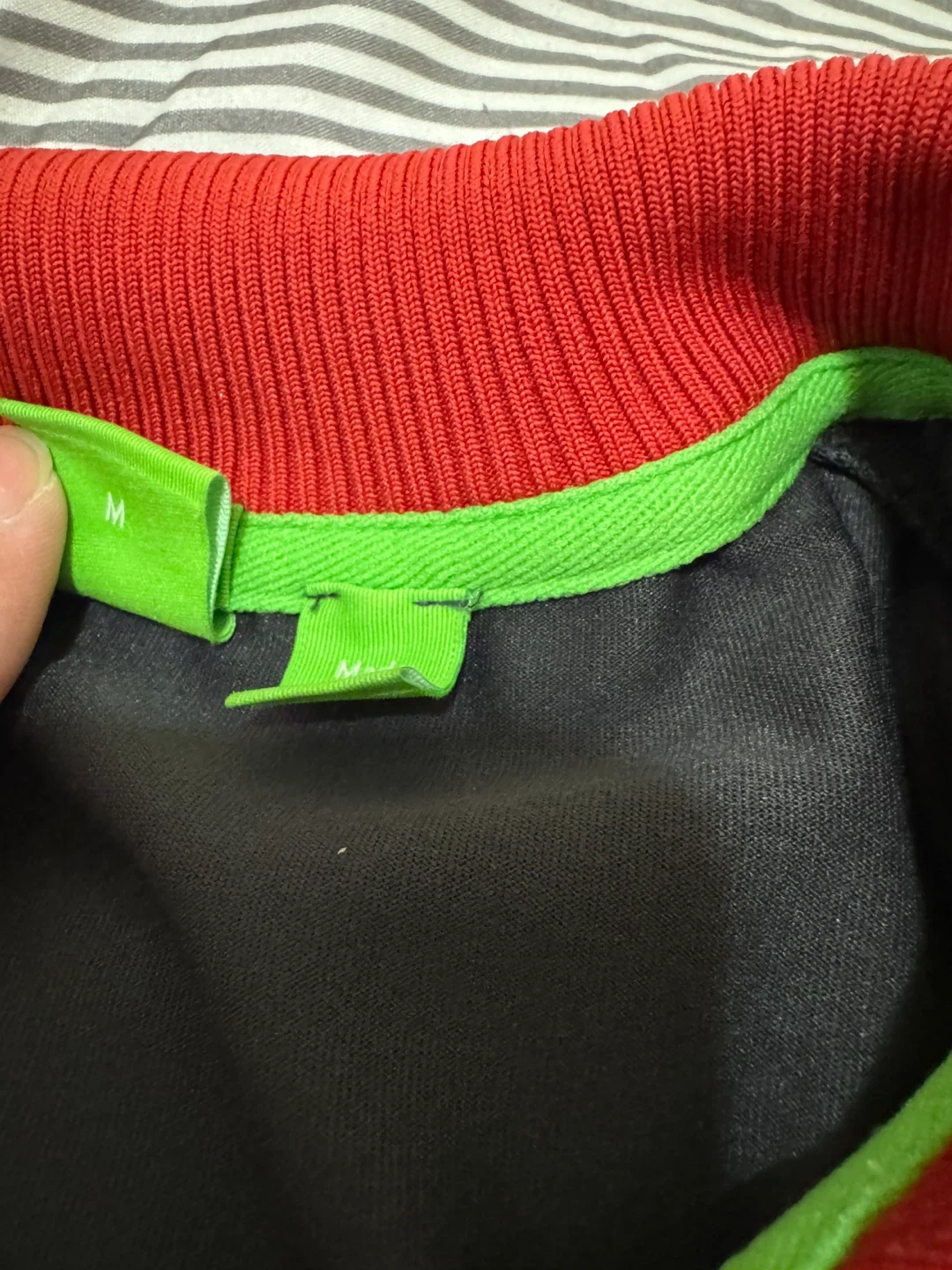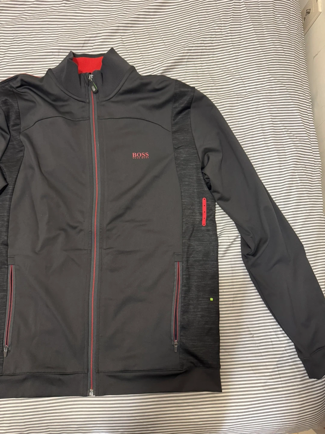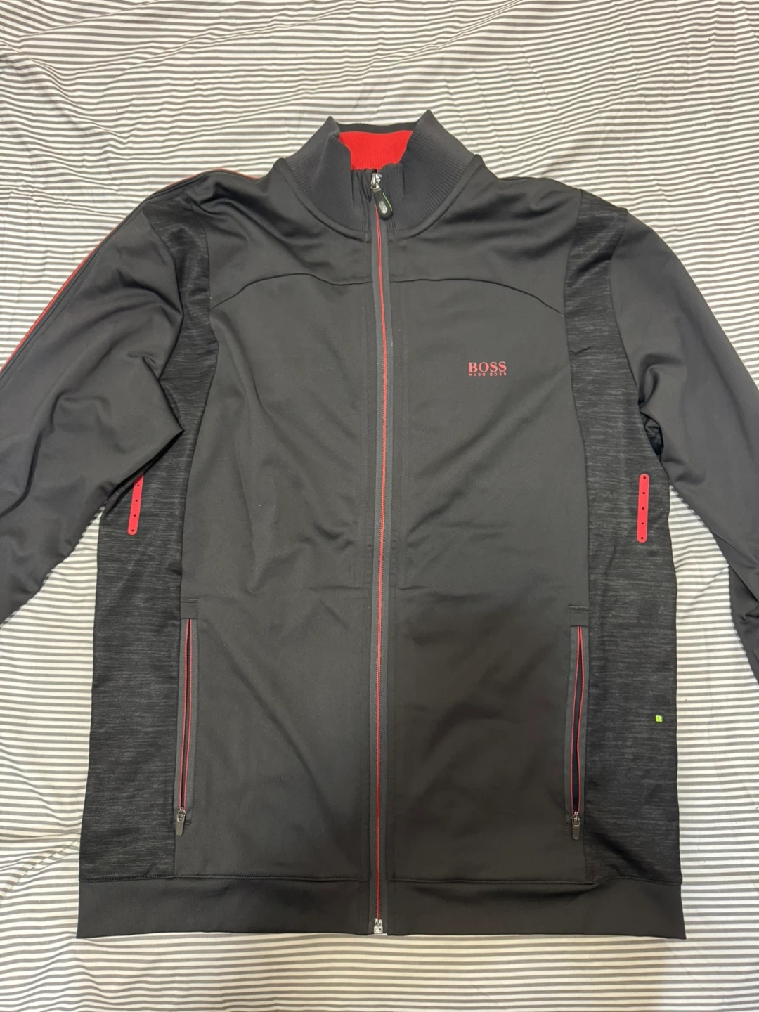 Hugo Boss track jacket in size M! It features a sleek black design with red accents. Perfect for workouts or casual wear. Free delivery within Markham and Scarborough.