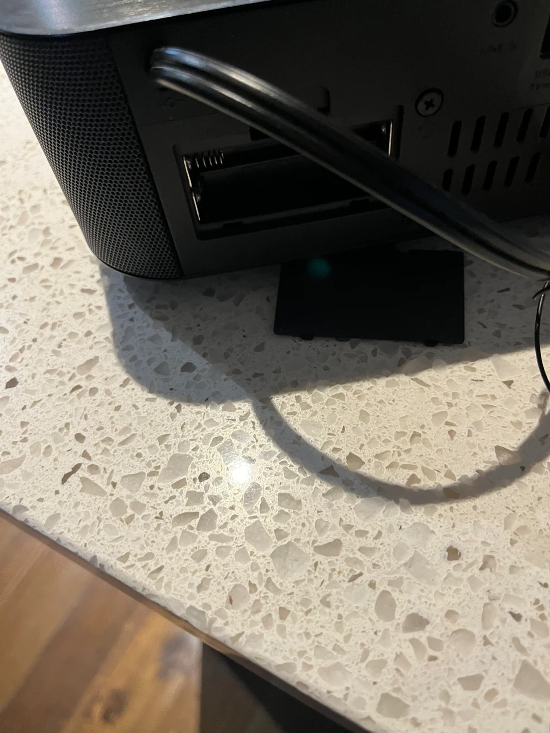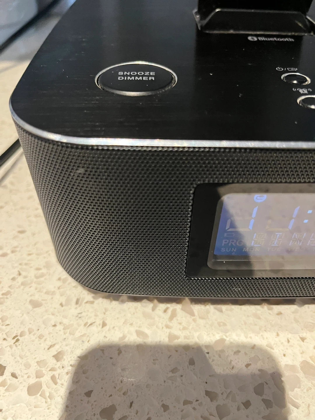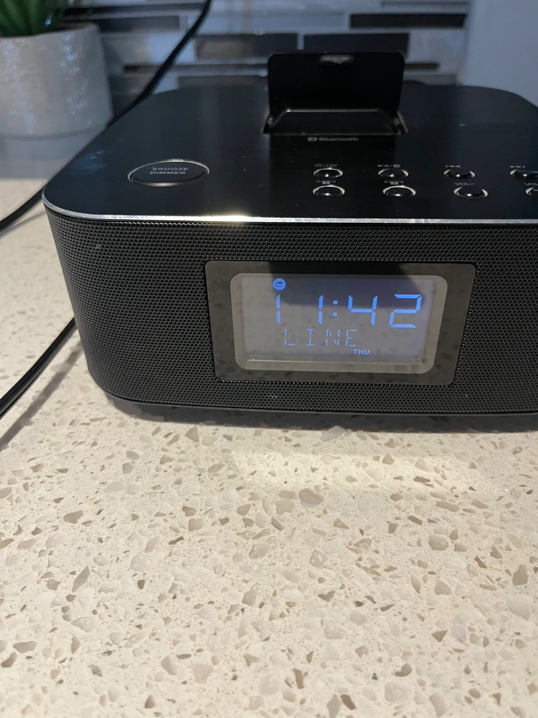 This is a black Blackweb clock radio that features Bluetooth connectivity. It includes a remote control for easy operation. It has a USB port for charging or playback and a line-in port.