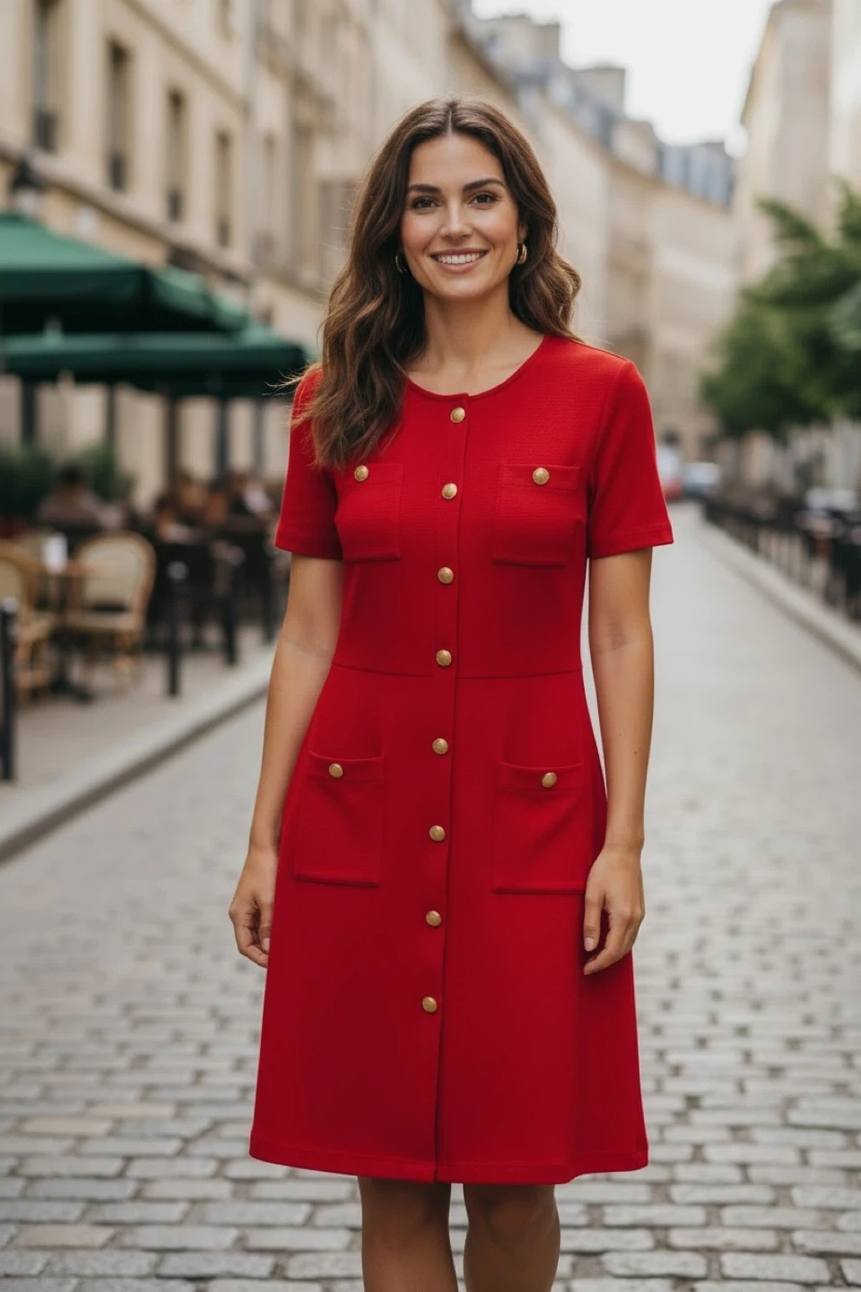 This is a short-sleeved red dress with gold-tone buttons and pocket details. It's made of a textured fabric. A great option for a smart casual look!