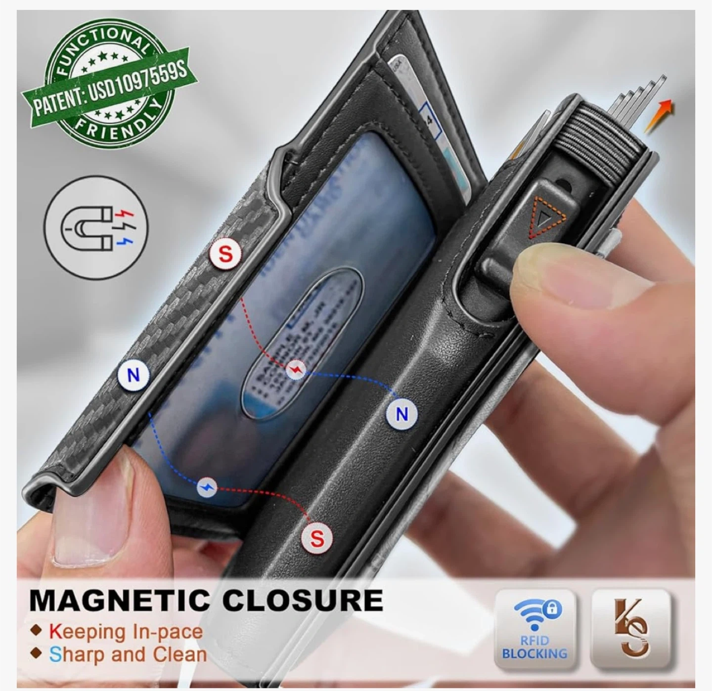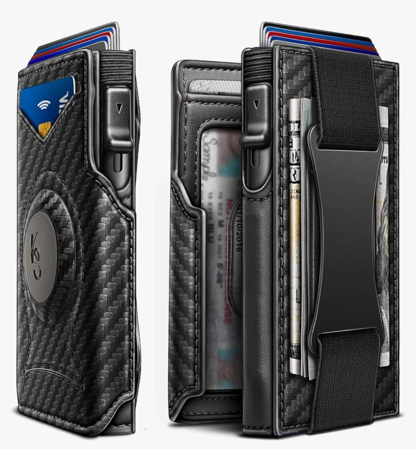 This carbon fiber wallet offers RFID blocking protection for your cards. It features a flexible money clip to hold your bills securely. It's designed to be compact and functional.