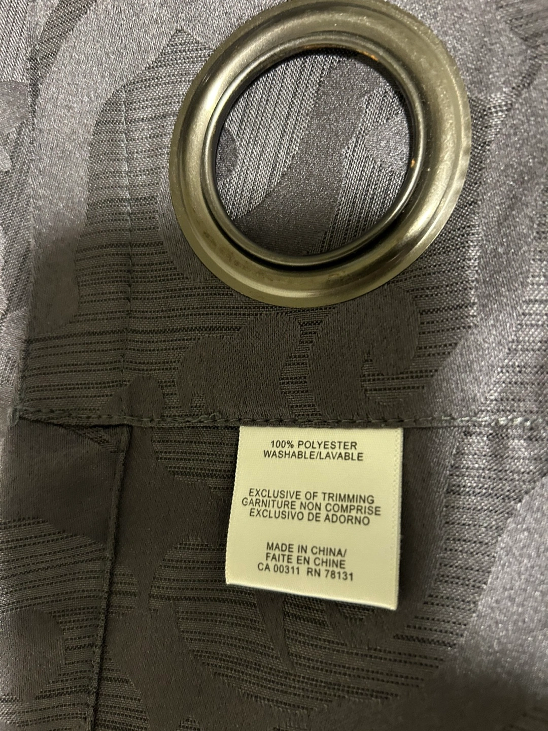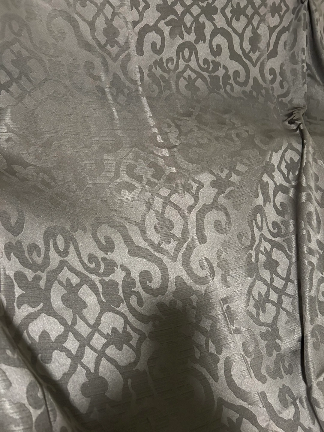 2 grey curtains have a damask-like pattern woven into the fabric. They're made of 100% polyester and are washable. The grommets make them easy to hang. These curtains are suitable for most living rooms or bedrooms.